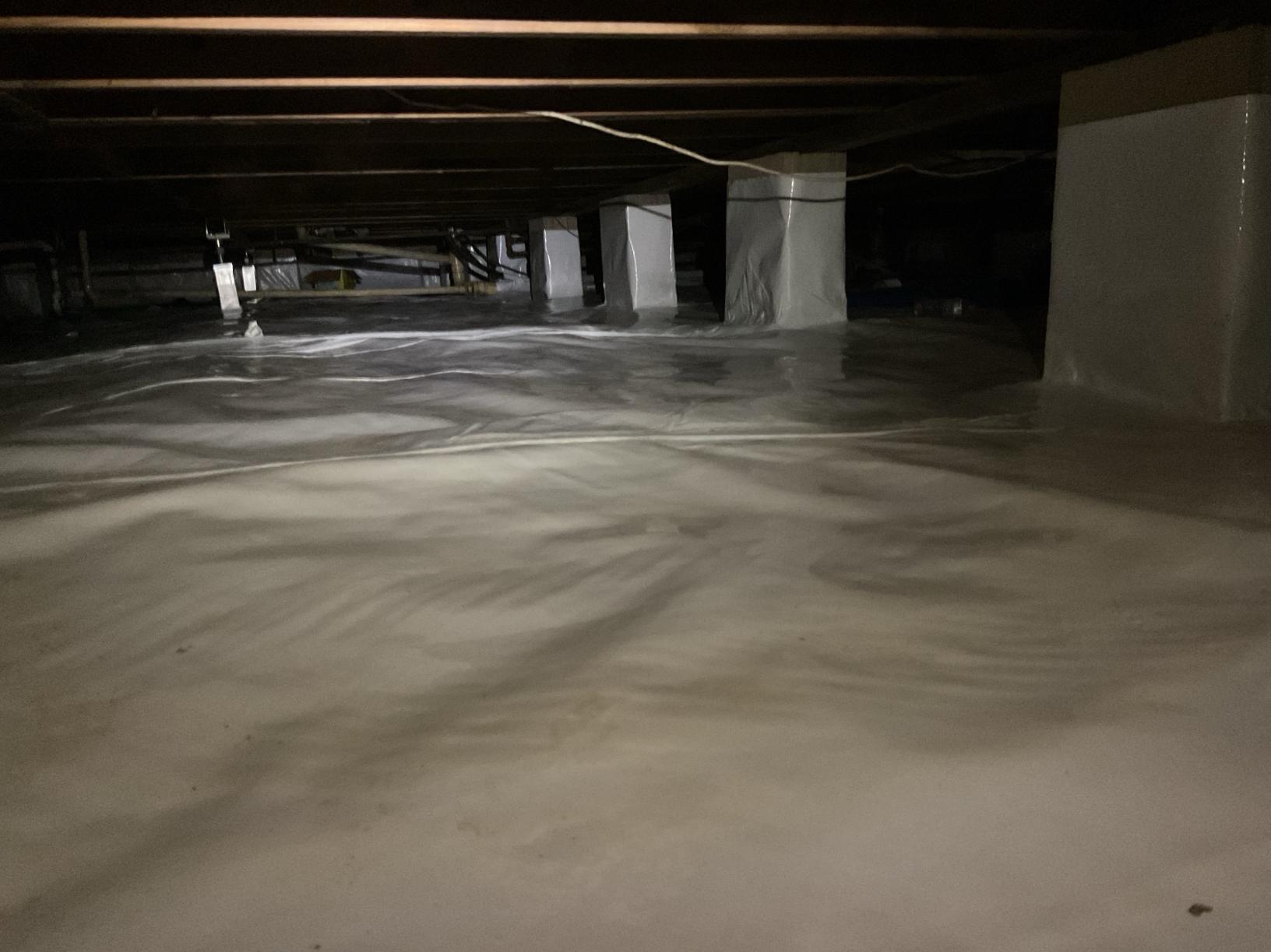 Bryan’s installation crew removed the debris and graded the crawl space. The SmartSump Sump Pump was installed, and a discharge line was run from the sump pump to 15 feet away from the home. The piers are wrapped with Wallie to direct condensation from the masonry to under the Drainage Matting. The Drainage Matting is a durable, puncture resistant polyethylene between two layers of Virgin HDPE. It directs water towards the perimeter or the sump pump, depending on the crawl space. It provides a thermal break under the CleanSpace Liner. CleanSpace Liner, with an antimicrobial additive called UltraFresh, isolates the home from the earth and reduces humidity in the air, helping to eliminate mold and rot. The SaniDry Sedona Dehumidifier was installed to pull moisture from the air at a rate of 100 pints per day, and it drains into the SmartSump to be pumped away from the home.