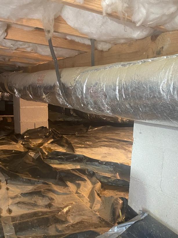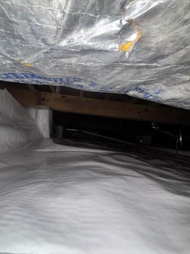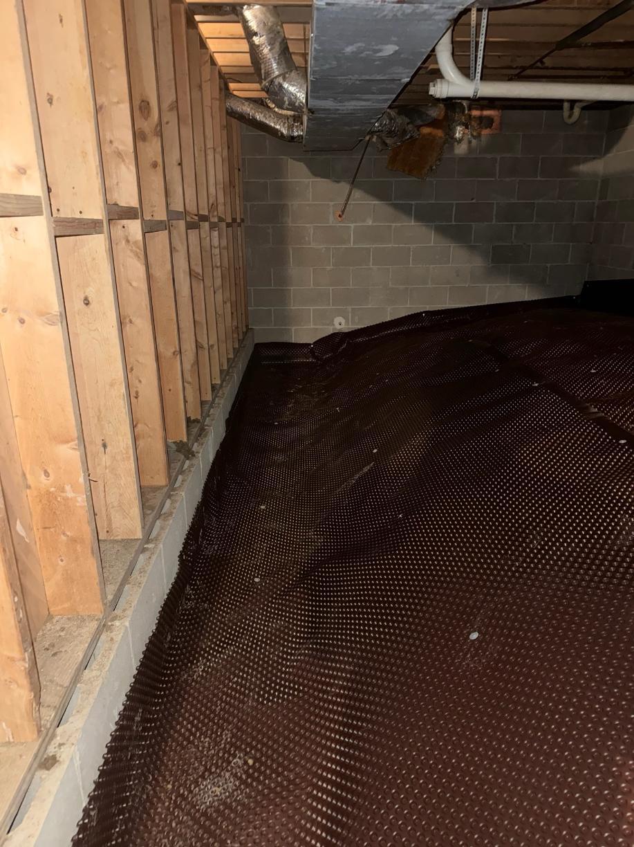 Our crew removed the falling down insulation and any other debris in the space. They then sealed the vents in the crawl space with SilverGlo Insulation Panels. Drainage Matting was laid down to help guide water out of the space. Drainage Matting also establishes a thermal break in the crawl space from the earth while softening the ground. A SaniDry Sedona Dehumidifier was also installed to keep the air dry and the relative humidity low.