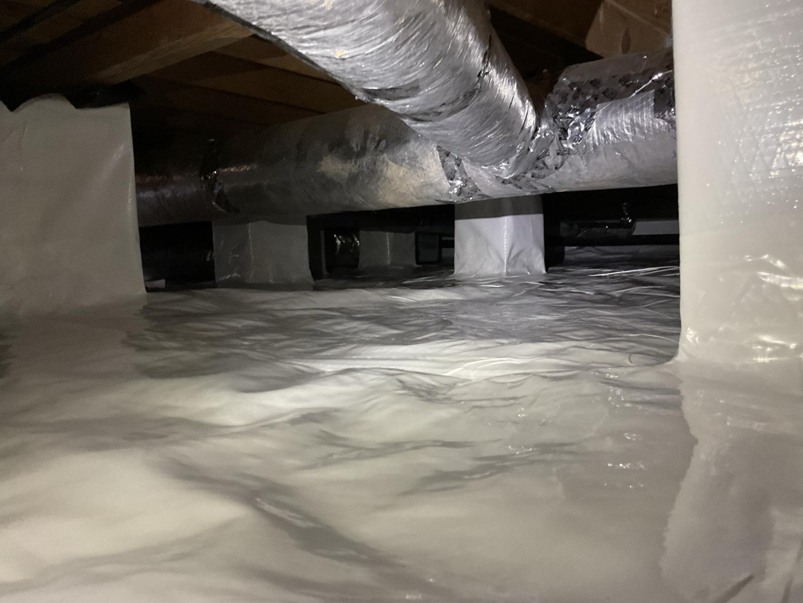 Our crew got right to work, installing drainage matting underneath a thick 20 mil CleanSpace vapor barrier, a SmartSump sump pump system, a SaniDry Sedeona dehumidifier, as well as vent covers and a new EverLast crawl space door. All of these products combined help keep the crawl space dry, clean, and much healthier for the homeowners!