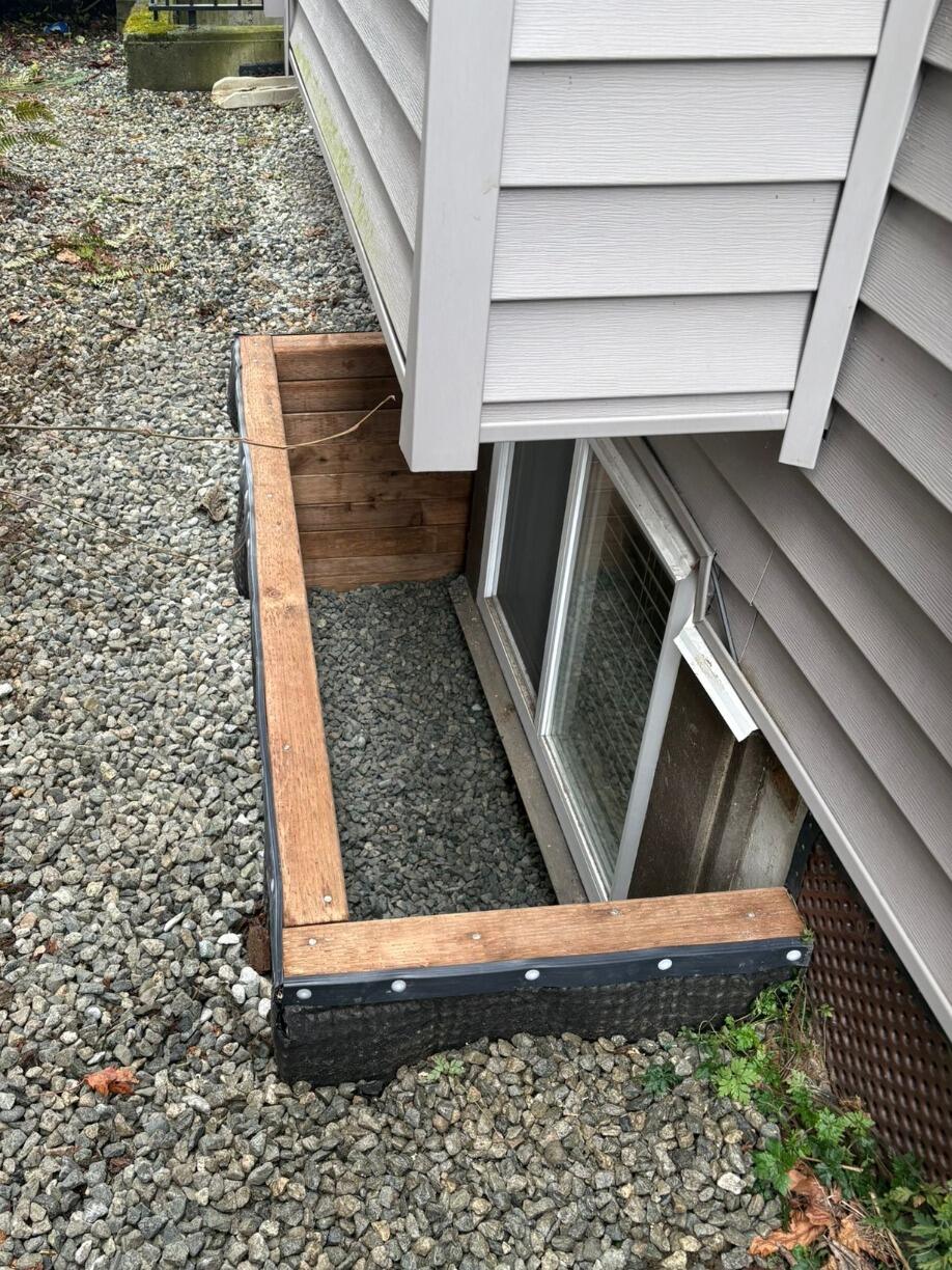 New window wells were built using treated lumber for strength and durability. A drainage mat was installed along the exterior of each well to guide water away from the foundation, with the top edge neatly finished using a mould strip. The areas were then backfilled with the existing soil for a clean, secure finish.