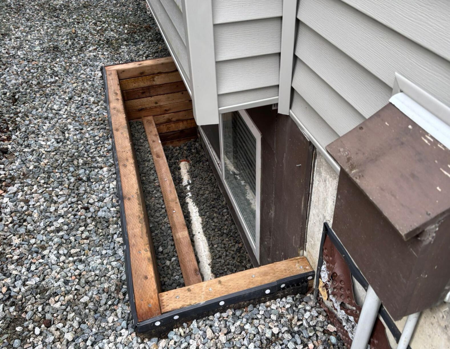 New window wells were then built using treated lumber for durability. A drainage mat was installed along the exterior of each window well to guide water away from the foundation, with the top edge neatly finished using a mould strip. Finally, the areas were backfilled with the existing soil, leaving both window wells clean, stable, and well-protected.