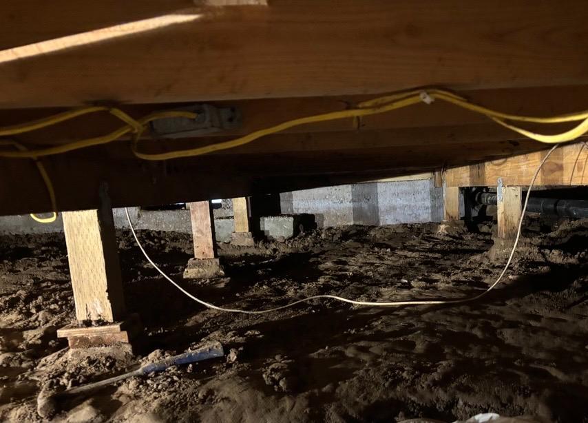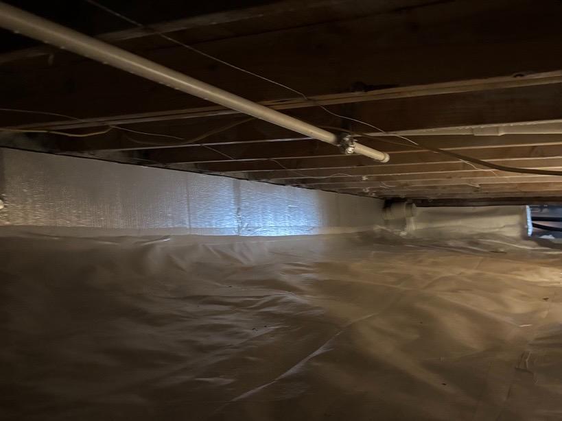 We installed a 100-ft subsurface drainage system using perforated PVC pipe with gravel and filter fabric, along with a new SmartSump basin and pump system. Drain lines were routed beneath the foundation and backfilled with concrete. The crawlspace was covered with 1,100 sq. ft. of drainage matting and 1,600 sq. ft. of CleanSpace encapsulation, including wrapped piers. Dehumidifiers and air scrubbers were used for a 4-day dry-out, followed by moldicide treatment of the subfloor and framing. Additional upgrades included R-6 insulation, a new 20-amp GFCI circuit with lighting, and thorough interior mold remediation, including deep cleaning of all surfaces, ductwork, and high-reach areas. A temporary fan system was installed for air testing and ventilation.
