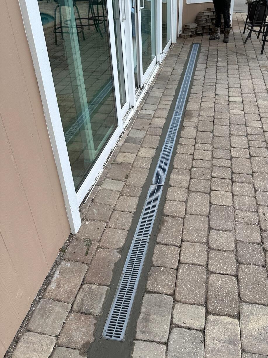 To solve the problem, our crew installed a sleek and durable drain system directly in front of the patio doors. The new trench drain redirects rainwater from the foundation, helping to prevent standing water and protect the home structure. Now, this homeowner can enjoy their patio worry free rain or shine!
