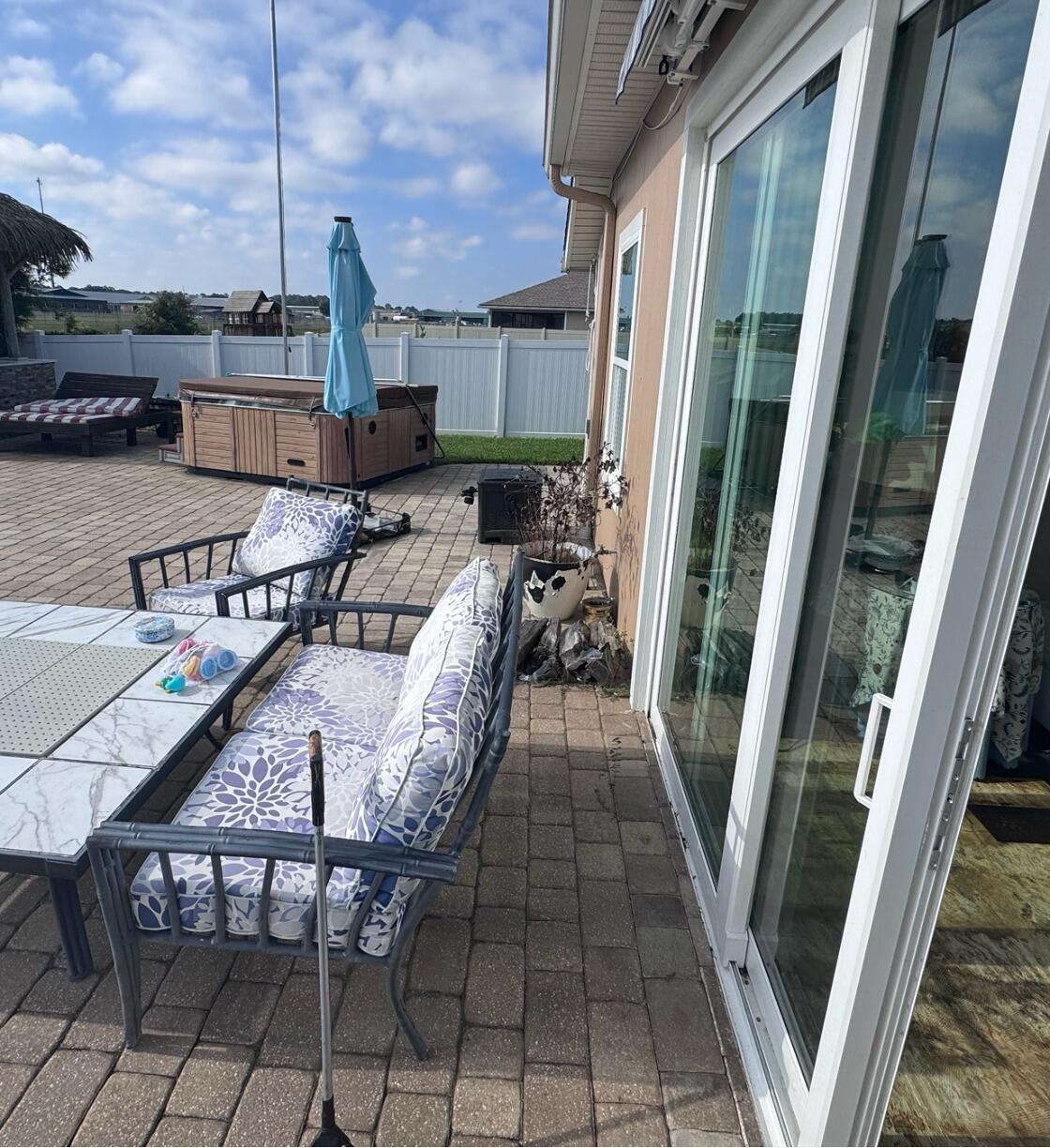 This beautiful outdoor space in Yulee, FL was facing a common but serious issue water pooling along the sliding glass door after heavy rain. Over time, this can cause erosion between pavers, foundation stress, and even water intrusion into the home.