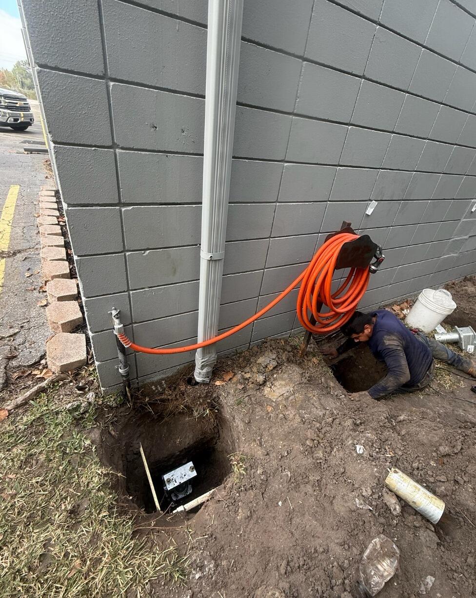 In Jacksonville, FL, our team installed helical piers to address foundation settlement along this commercial block wall. The crew carefully excavated targeted locations, exposed the footing, and installed high-strength helical piers designed to transfer the building’s weight to stable, load-bearing soil.