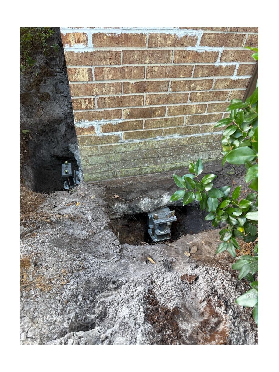 These photos show the installation process, including excavation around the footing and placement of the helical pier brackets beneath the structure. By transferring the load to deeper, stable soil layers, the helical piers provide long-term stabilization and help prevent further cracking or structural damage.