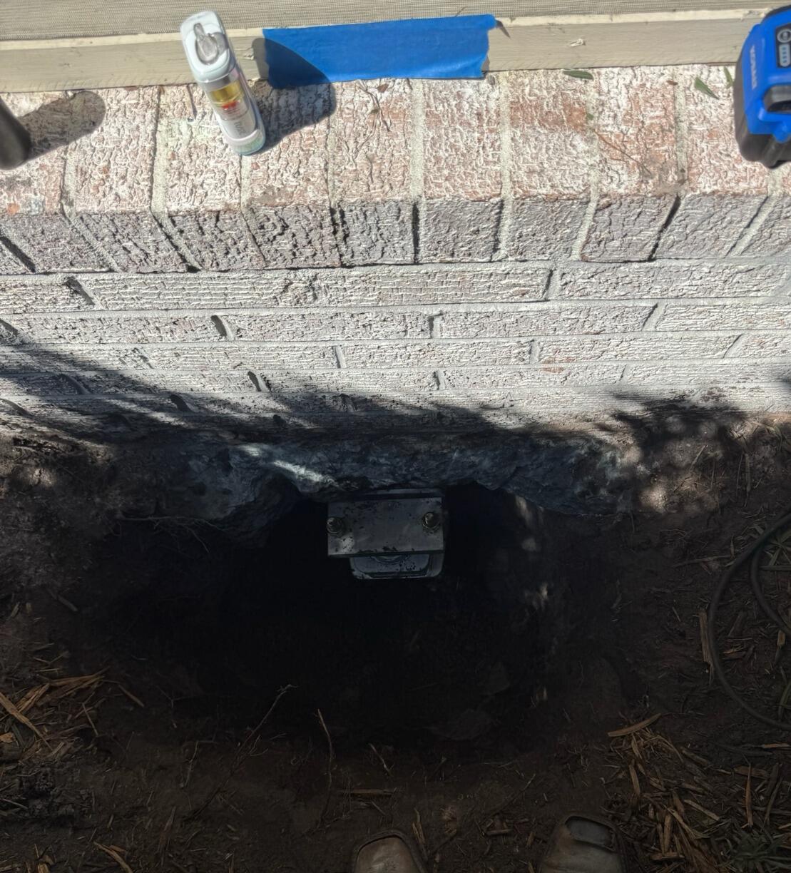 To permanently stabilize the foundation, our team installed a helical pier system. Helical piers are engineered steel supports that are advanced deep into stable load-bearing soil beneath the home. Once properly installed and secured to the foundation, they help stop further settlement and can even lift the structure back toward its original position.