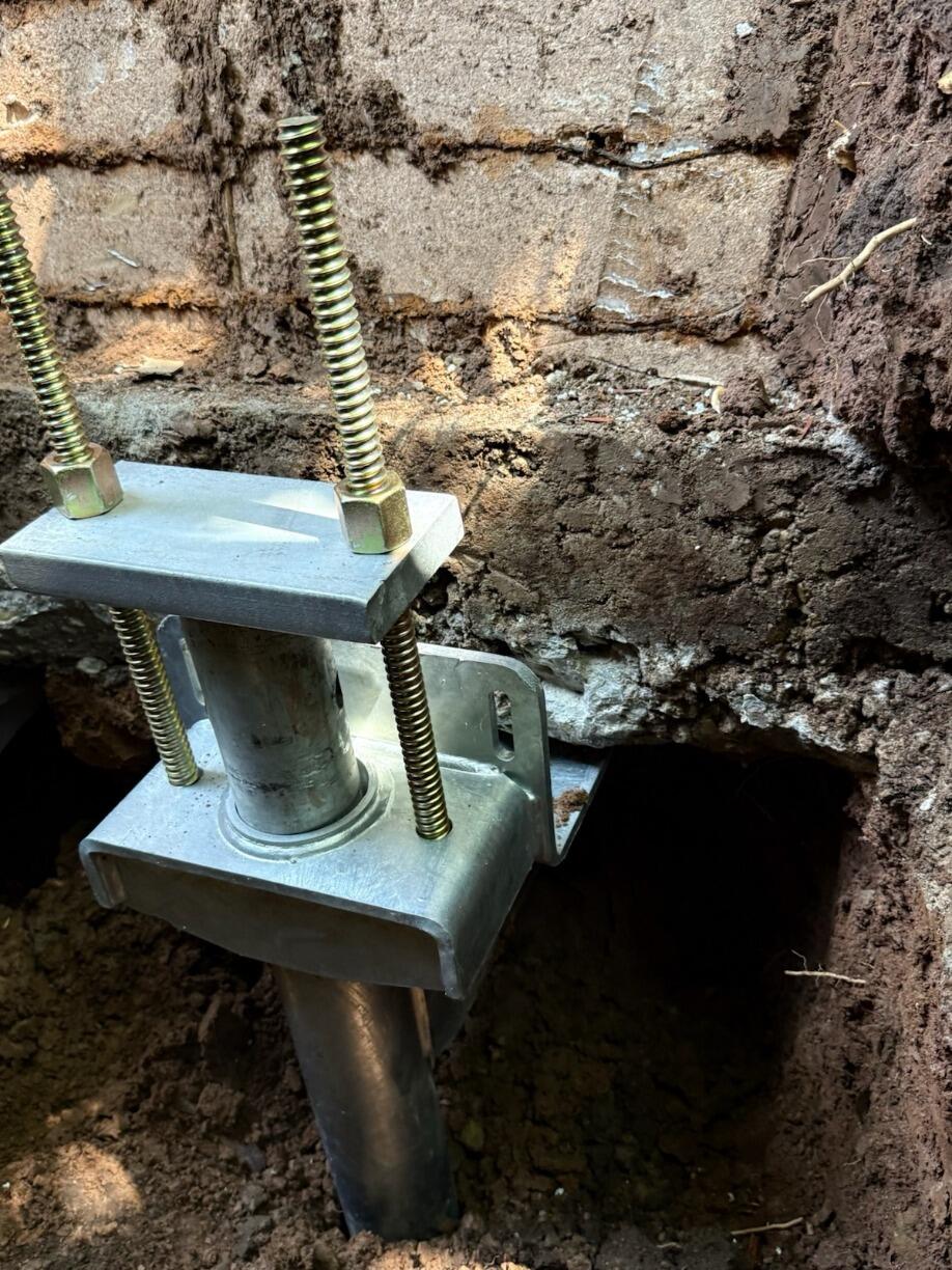 Sure-Dry installed the Push Pier Foundation Piering System to stabilize and lift the settling foundation. These steel piers are driven deep into stable load-bearing soil or bedrock, allowing the weight of the home to be transferred off the unstable upper soils. Installation was completed by trained specialists, restoring structural support and preventing further settlement.