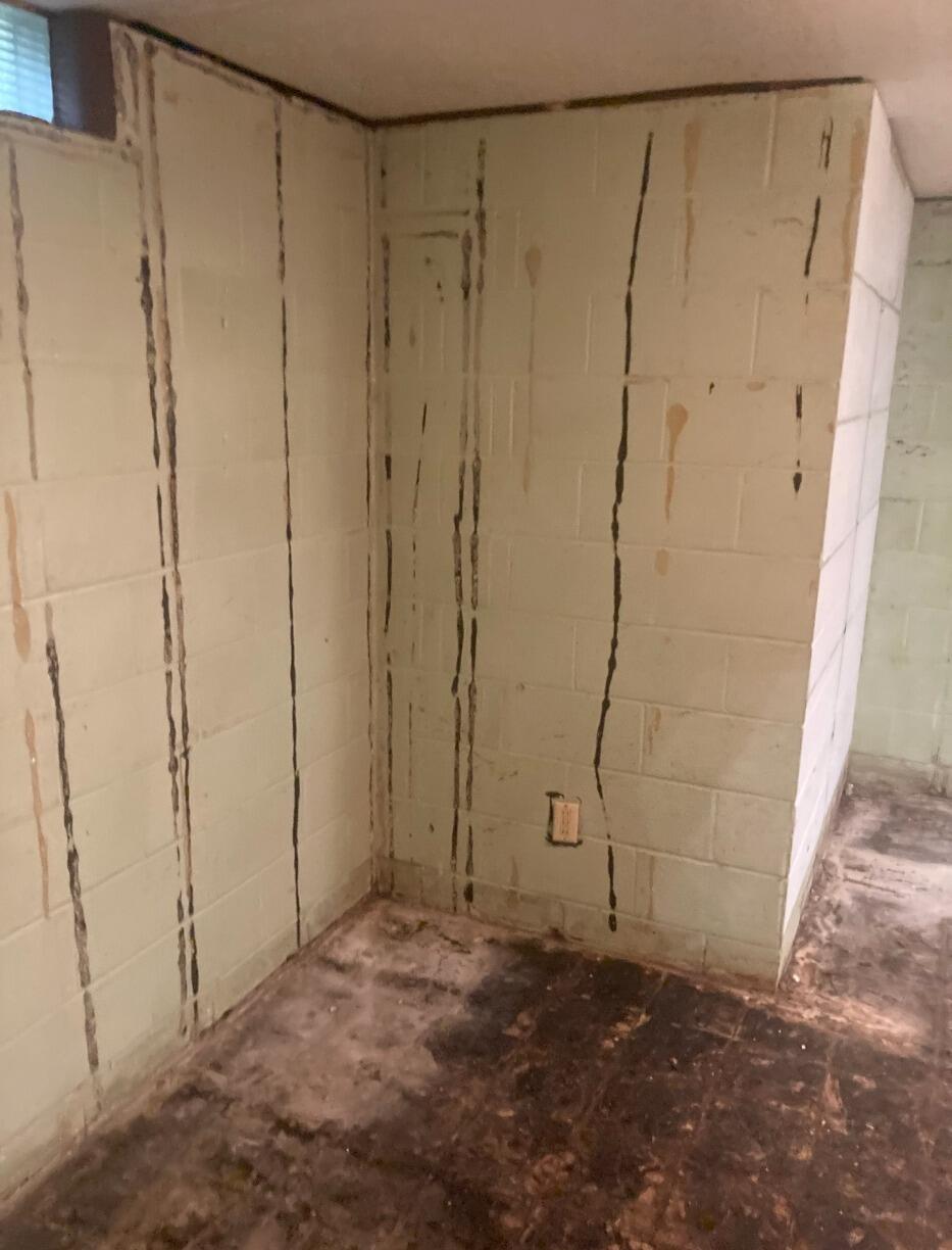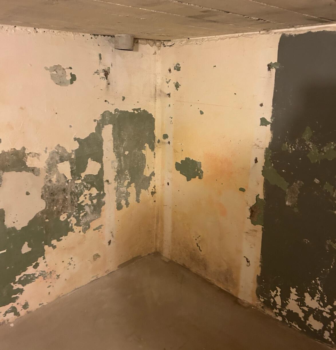 This basement corner showed clear signs of water damage. Peeling paint, efflorescence, and discoloration from moisture intrusion through the concrete walls and floor joints are evident.