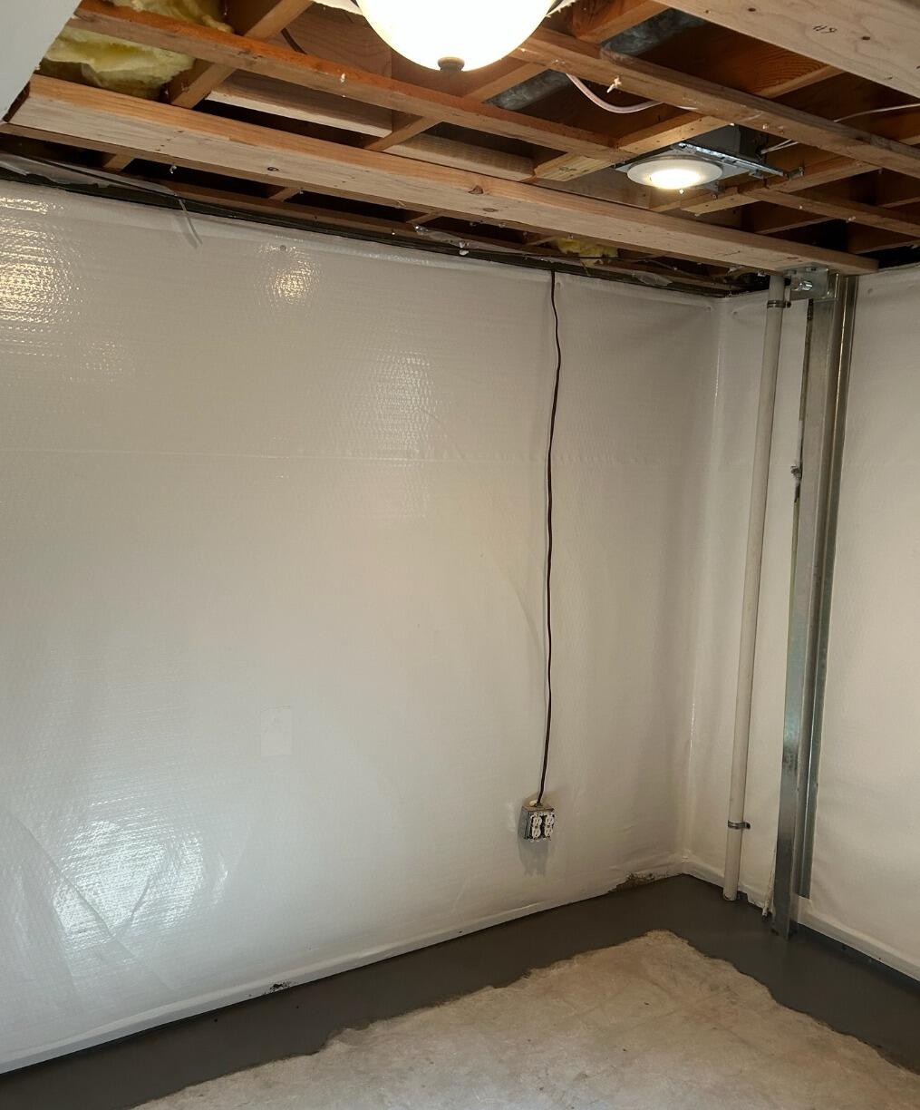 After a thorough inspection, we installed our WaterGuard drain tile system to capture groundwater seepage and direct it safely away from the foundation. To keep the space bright, clean, and protected, we lined the walls with our CleanSpace vapor barrier, which helps prevent moisture and humidity from entering through porous concrete.
