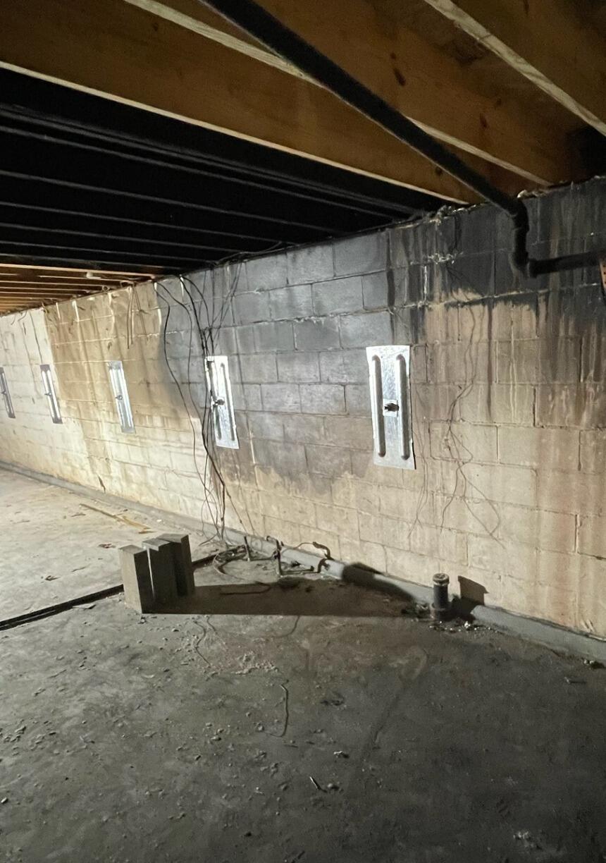 Our Foreman, Tremaine, and his production manager began the project by digging small holes outside the home, beyond the foundation. From the interior foundation, Tremaine and his crew inserted a long, steel rod through to each hole outside of the home. At the ends of each rod, our crew installed an anchor and a wall plate which provides the pressure to make the system work. Our anchors extend out to the hard-packed soil, anchoring themselves and bracing the foundation wall, which stops inward movement. Over time, our anchors can be tightened by the homeowner to ensure the system is sticking to its design. To complete the installation, Tremaine and his team backfilled each hole, compacted the soil, and ensured the outdoor space was neater than when they found it.