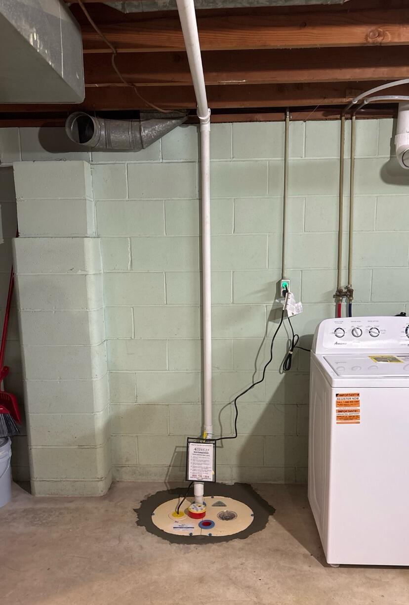 Our Foreman, Cameron, and his crew quickly and efficiently installed the system. First, our WaterGuard is a patented below-floor drain that rests in a drainage bed on top of the foundation footing. It is our most commonly used drain system because of its resistance to water clogs, easy-to-access service ports, and ability to collect leaking water from basement walls. The team then covered the open gaps with rock and replaced the concrete. Then, the SuperSump Plus. In addition, the plan was to add a discharge line to ensure the radon went up and out of the house.