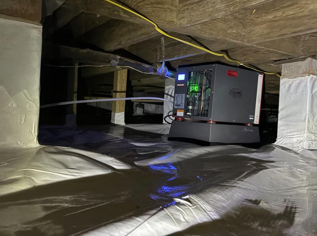 Our design specialist was happy to discover that this crawl space was pretty tall compared to the low spaces we typically see. But the other main thing he noticed was the vapor barrier that had been under the home for quite a while. We do not know when it was installed, but it clearly did not stand the test of time. There were rips, completely pulled away exposes areas, and mud and plenty of other stains on top of the liner. This liner not doing its job meant that moisture was still having its effect on the crawl space. Fortunately, we came prepared with the needed replacement! Our CleanSpace Liner is much more durable, tightly secured to the walls, supports, and floors of the space, and work in tandem with several of our other fantastic moisture proofing products, such as our dehumidifier you can see in the image!