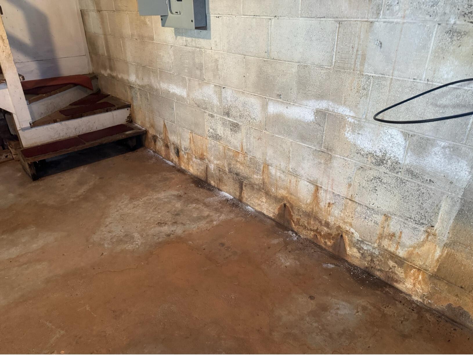 This Winston-Salem basement was showing clear signs of ongoing water intrusion, including visible moisture along the foundation walls, rust staining, and water pooling on the floor. These symptoms often indicate hydrostatic pressure forcing water through the block walls and at the wall-floor joint, leading to potential mold growth, structural concerns, and unhealthy indoor air.