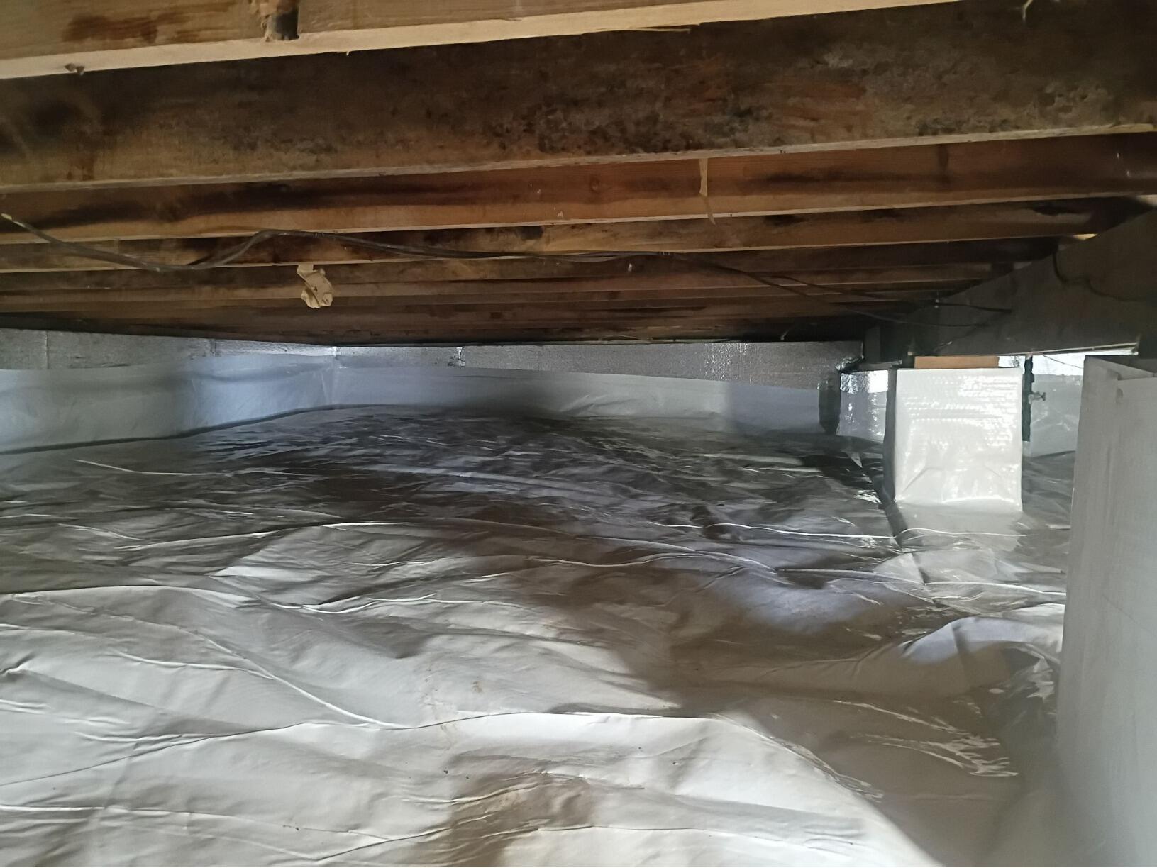 In order to keep this crawl space safe from moisture, we placed down our CleanSpace crawl space liner, which will block out moisture from the earth. This liner went on top of our drainage matting, which can not be seen from the picture. The drainage matting helps drain water to the sump and also softens the area. We tape the liner at all seams with waterproof tape, and we button the liner up the walls of the crawl space. We also installed SilverGlo insulation along the walls, which are made of an inorganic material and are unable to grow mold.