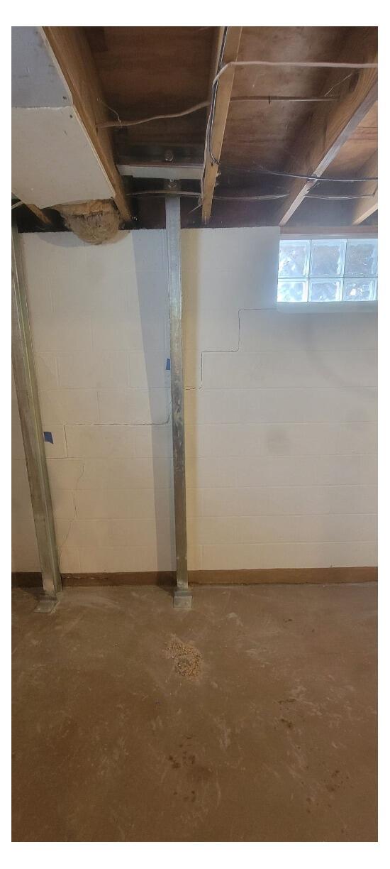 The movement in this block foundation was stopped by our patented PowerBrace wall stabilizers. These galvanized steel beams utilized the home's joist system in order to hold the wall still. PowerBraces can even be adjusted over time to bring the wall to a straightened position!