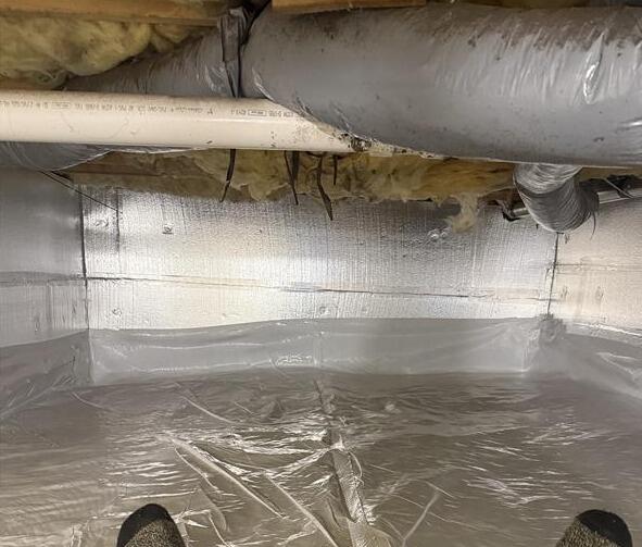 Throughout this crawl space, SilverGlo insulation board was installed on the walls and our CleanSpace vapor barrier was fastened around the piers and to the floor. The vapor barrier acts as a barrier to keep moisture from entering the crawl space. Additionally, it helps to keep the area dry and free from mold and other moisture related damage. The insulation board also helps to keep the temperature of the crawl space regulated.