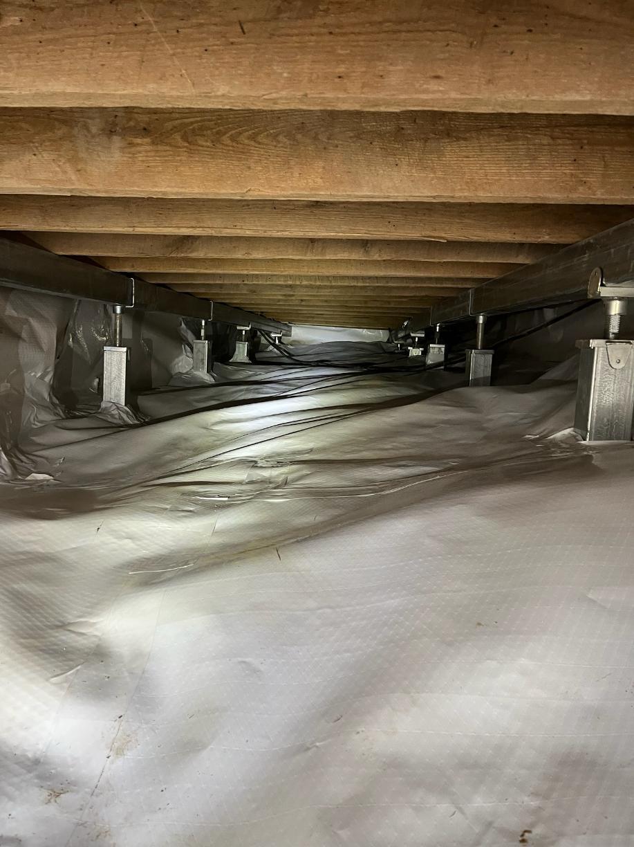 Sinking floors in this cabin home prompted the homeowner to give us a call. Moisture in the crawl space had caused the beams to become weak and as a result, the floors in the home had begun to sag. We supported the beams with SmartJacks! These fully adjustable steel support posts bring floors back up to where they were. We tackled the moisture issues with a CleanSpace Encapsulation System. CleanSpace is our 20mil thick, ultra durable liner that creates a vapor barrier.