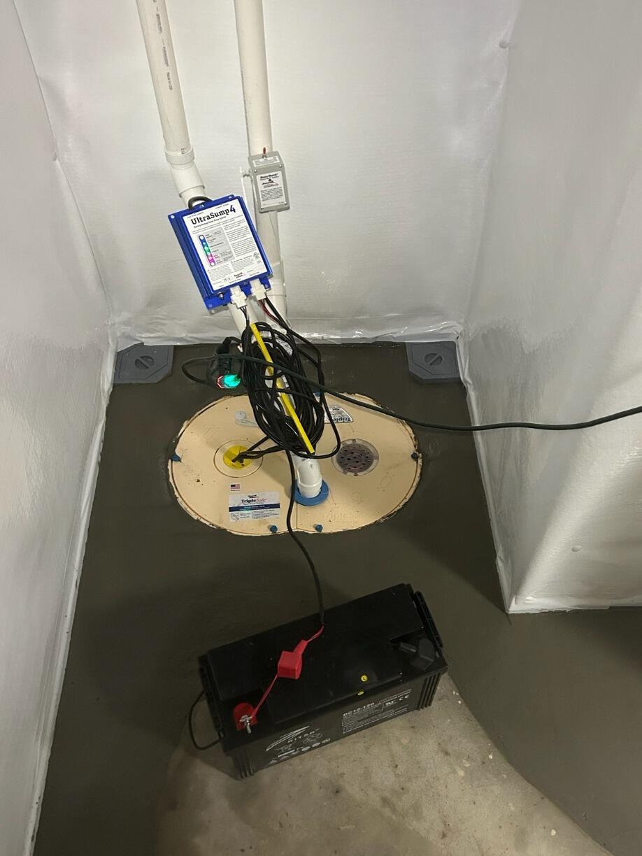 We installed the TripleSafe Complete pump system with twin liner, 1/3 HP cast-iron primary AC pump, 1/2 HP cast-iron AC back-up pump, and UltraSump battery back-up pumping system with charging/control box with alarm, and 120 amp sealed maintenance-free battery as well as CleanSpace wall liner on walls up to 8 feet high where indicated and we removed existing insulation in floor joists and hauled off for the customer.