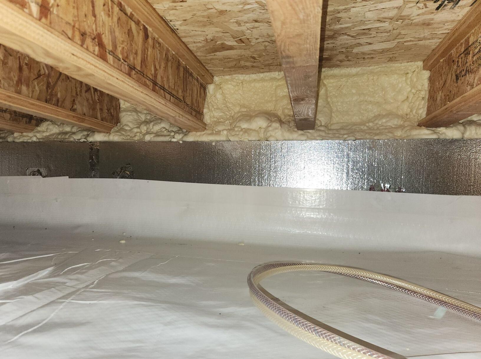 The crawl space was fully encapsulated with CleanSpace®, creating a durable vapor barrier that seals out ground moisture and helps prevent humidity from entering the space. The rim joists were insulated and air sealed using RimTight® to block air leakage, reduce condensation risk, and improve overall energy efficiency. Crawl space walls were then insulated with SilverGlo® rigid foam panels to provide continuous thermal insulation and moisture resistance.