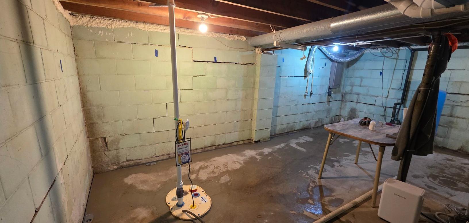 Before: A homeowner in Kewaskum, WI contacted us after noticing a failing block basement wall with visible bowing and horizontal cracking. Over time, pressure from surrounding soil had pushed the wall inward, raising serious structural concerns.