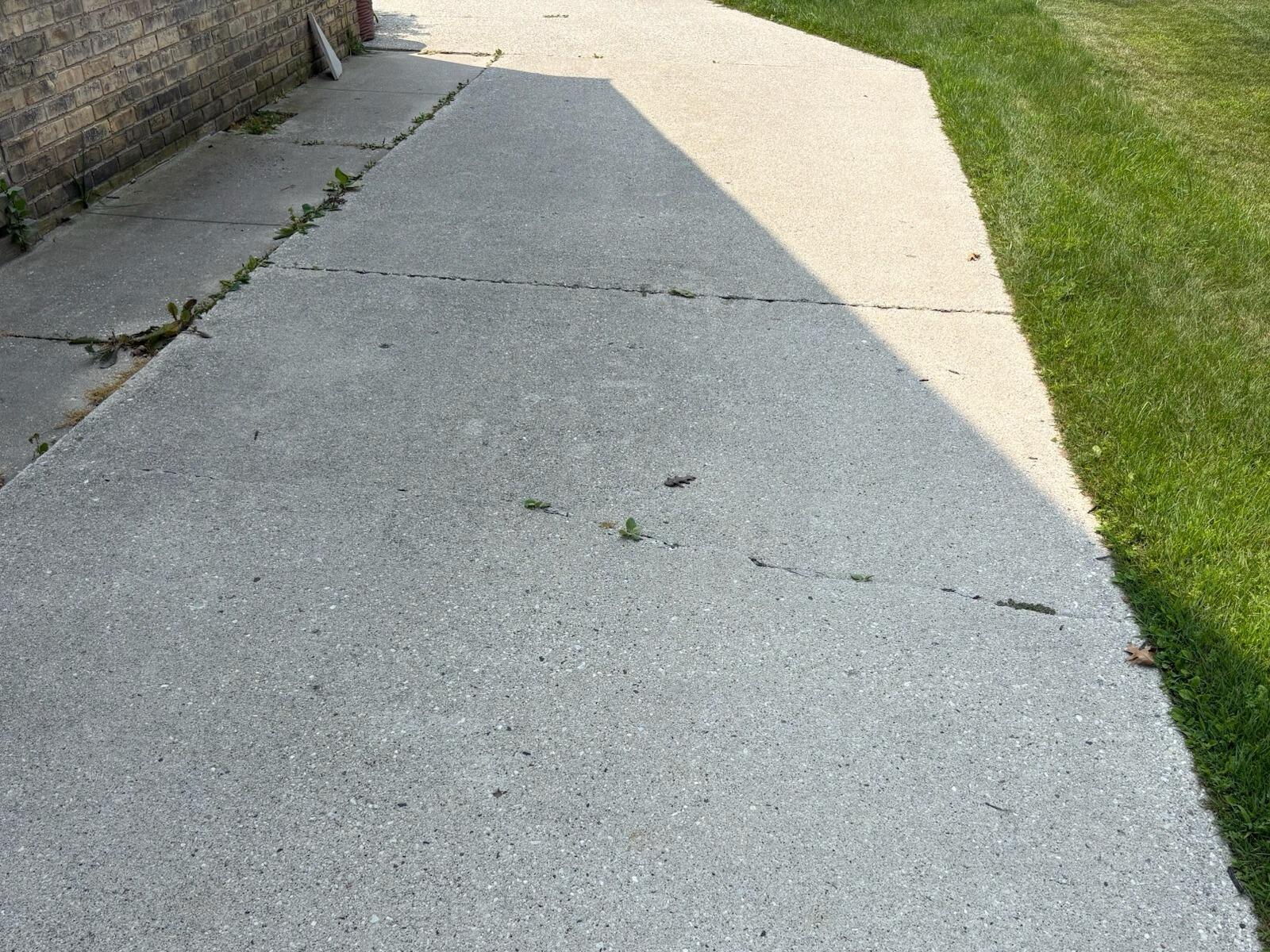 The homeowner in Manitowoc, WI had a concrete driveway with sections sinking and cracking, allowing weeds to grow through the joints and contributing to uneven slab transitions. Soil washout and freeze-thaw cycles caused settlement, prompting the homeowner to explore concrete lifting and concrete leveling options to correct the sinking concrete and eliminate vegetation growth through the cracks.