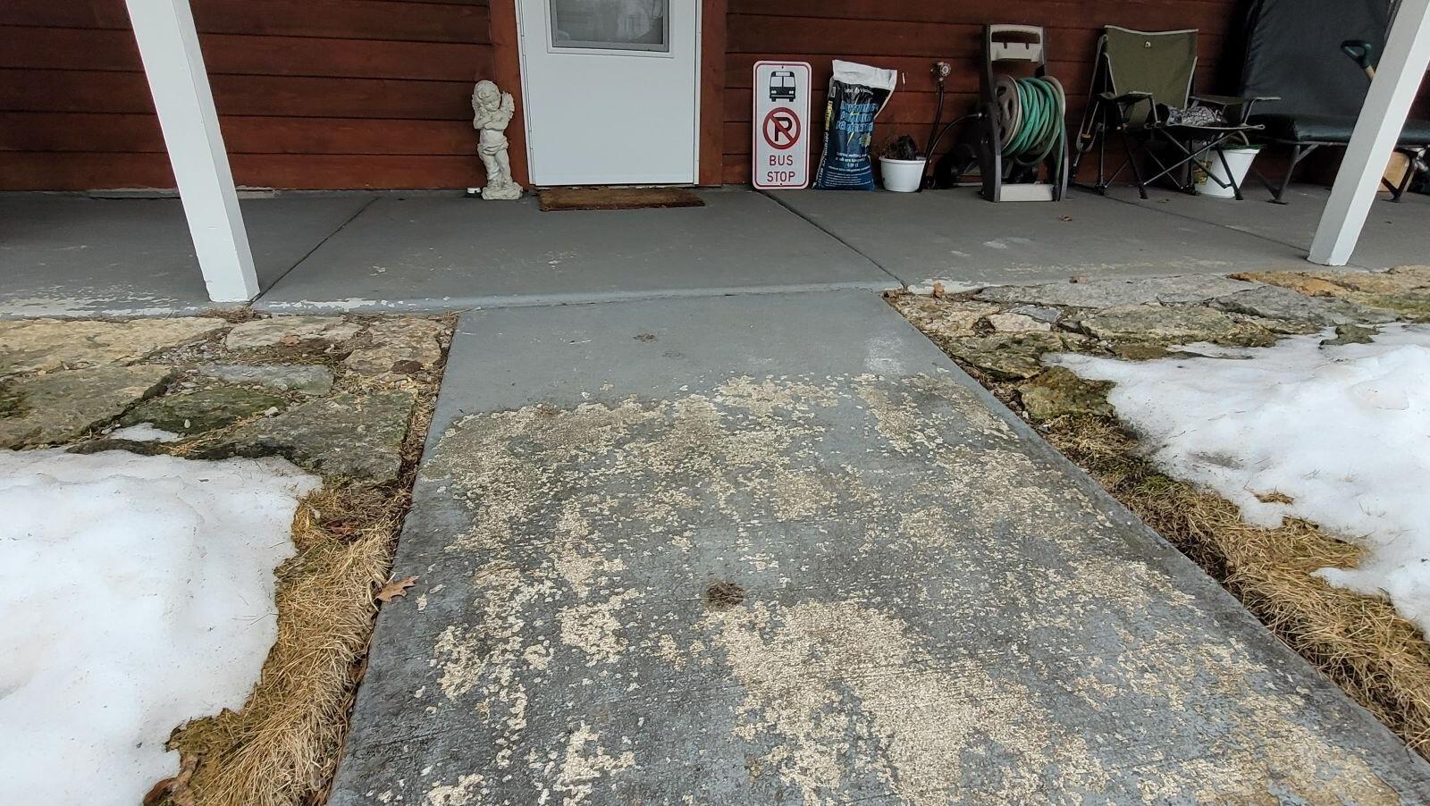 The homeowner in Marinette, WI had a settled sidewalk leading up to the home, creating an uneven walking surface and a noticeable drop near the concrete patio located beneath a roof overhang. The settlement posed a trip hazard and allowed water to collect and drain back toward the foundation. Limited access from the roof overhang made full concrete replacement impractical, while Wisconsin freeze-thaw cycles continued to worsen the uneven slabs.
