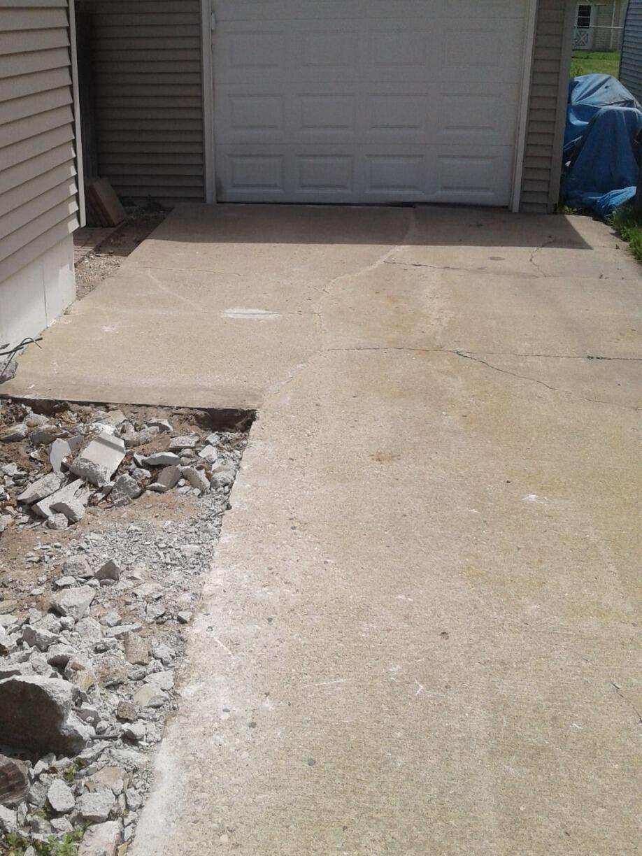 The homeowner in Marinette, WI had a severely cracked and sunken concrete driveway along with an uneven walkway leading to the front door. The settlement created multiple trip hazards and caused improper drainage toward the home, while widening cracks allowed water to reach the soil below. These conditions are common in northern Wisconsin where freeze-thaw cycles and soil movement accelerate concrete deterioration.