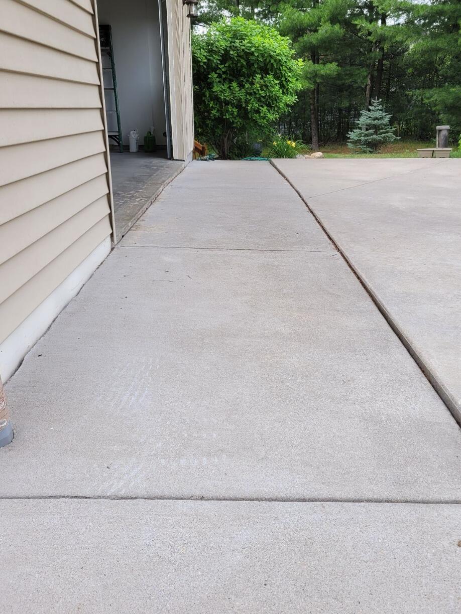 Sure-Dry stabilized and lifted the settled concrete using PolyLevel®, a high-density polyurethane foam designed for concrete lifting and leveling in Wisconsin’s freeze-thaw conditions. The system restored proper elevation to the sidewalk and wrap-around walkway, improving drainage and eliminating trip hazards along the path to the deck and past the picture window. All cracks and joints were then sealed with NexusPro®, creating a flexible, watertight barrier that helps prevent water intrusion and future deterioration.