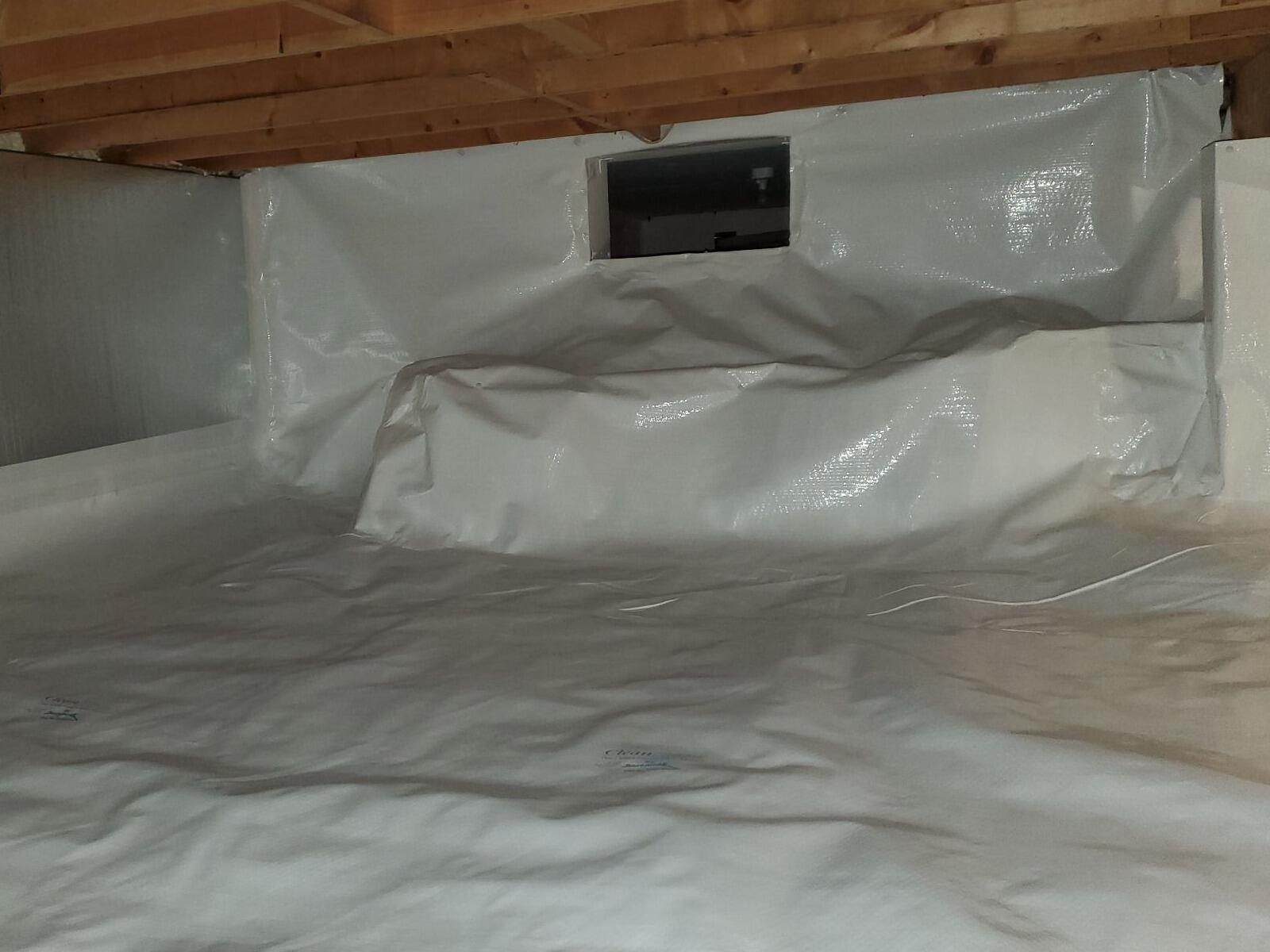 Sure-Dry installed a full crawl space encapsulation system using CleanSpace® vapor barrier to isolate the space from ground moisture and create a continuous vapor barrier across the floor and foundation walls. The walls were insulated with SilverGlo™ panels, the rim joists were sealed with RimTight™ to eliminate air infiltration, and a new sump pump with UltraSump® battery backup sump system was installed to actively manage groundwater and provide protection during power outages.