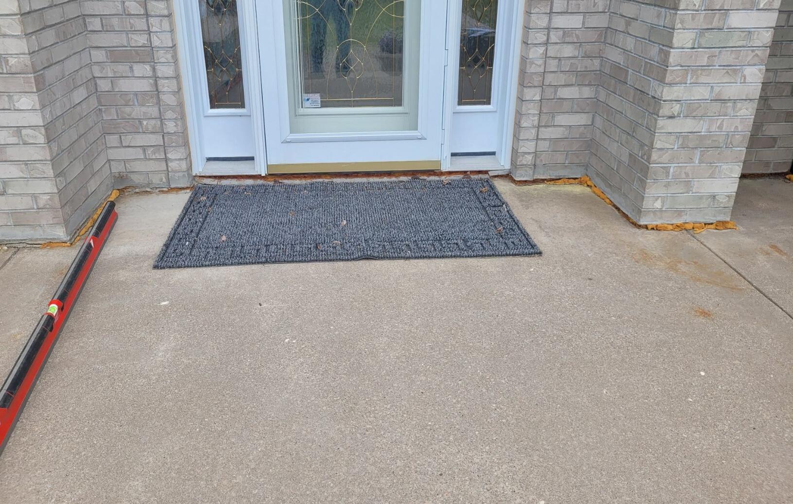 Before The homeowner had a large concrete entryway leading to the front door, including multiple steps that had settled unevenly over time. The slab had dropped in sections, creating trip hazards at the transition points and allowing water to pool near the foundation after heavy rain. Cracks had formed along the control joints and step seams, accelerating deterioration during seasonal freeze-thaw cycles. Concerned about safety, drainage, and curb appeal, the homeowner began searching for concrete lifting and concrete leveling solutions to restore stability without replacing the entire entry.