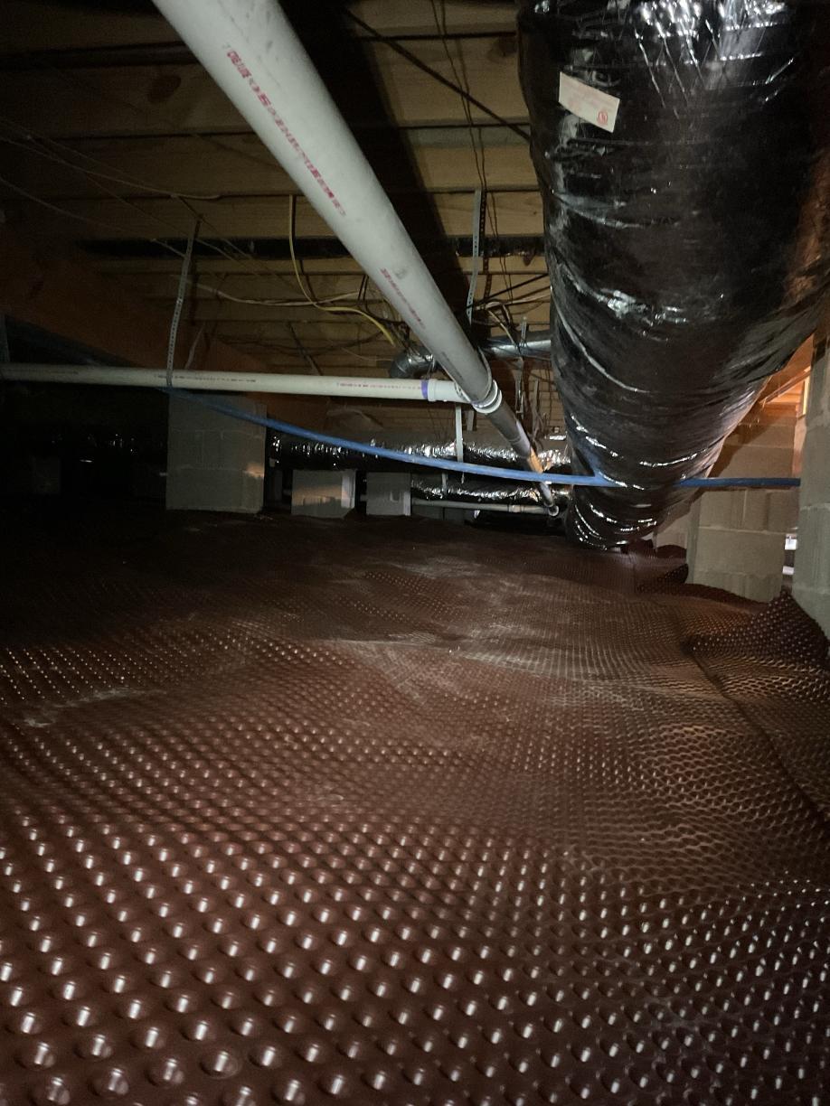 To insulate the space, we put in SilverGlo Insulation Panels. These graphite infused panels are 24% more effective than conventional foam. Next the crew installed Drainage Matting. Drainage Matting helps isolate the crawl space from the earth and creates a thermal break. The dimpled texture of the Drainage Matting helps direct surface water out of the crawl space.