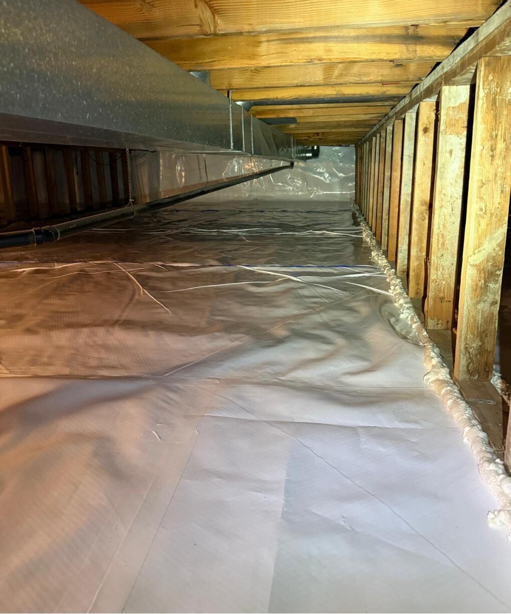 We recently finished a full crawl space makeover to help make this area cleaner, drier, and better protected for the long term. First, we installed a heavy duty liner system to seal off the space and keep out moisture, making sure everything was tightly secured around the walls, footings, and insulation. To help with drainage and make the ground more comfortable for storage, we laid down a special mat under the liner and brought it up along the lower walls. We also added insulation around the rim of the crawl space to help improve energy efficiency. Next, we treated all the wooden and organic surfaces to prevent mold, gave the space a good cleaning including wiping down the tops of heating ducts and pipes, clearing out spider webs, and removing any loose debris. We also repaired a crack in the foundation by injecting it with a flexible sealant and reinforcing it with a strong material to keep it stable and dry.