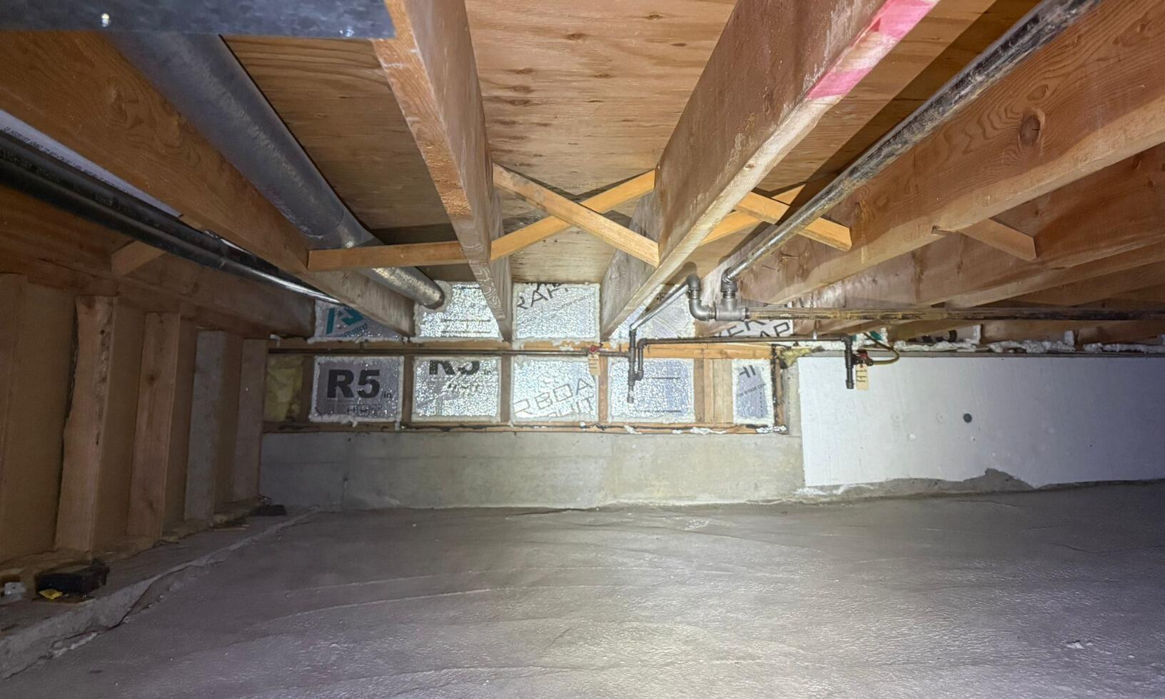 After that, we sealed the crawl space with a liner that was carefully fastened and air-sealed around the footings, piers, and near the top of the foundation walls. Where insulation was already in place, we finished the liner neatly in front of it for a clean look.