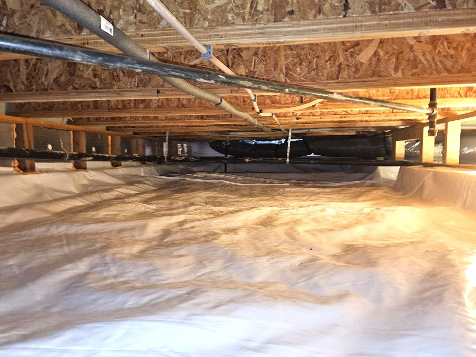 Humidity was turning this crawl space into a safe haven for mold. The loose, flimsy liner simply couldn't protect it from the natural water vapor that rises from the earth below the home. However, after permanently encapsulating their crawl space with our heavy, 20 mil CleanSpace liner, this crawl space will stay far more dry and reduce microbial growth. To learn more about our high-quality CleanSpace encapsulations, contact us today!