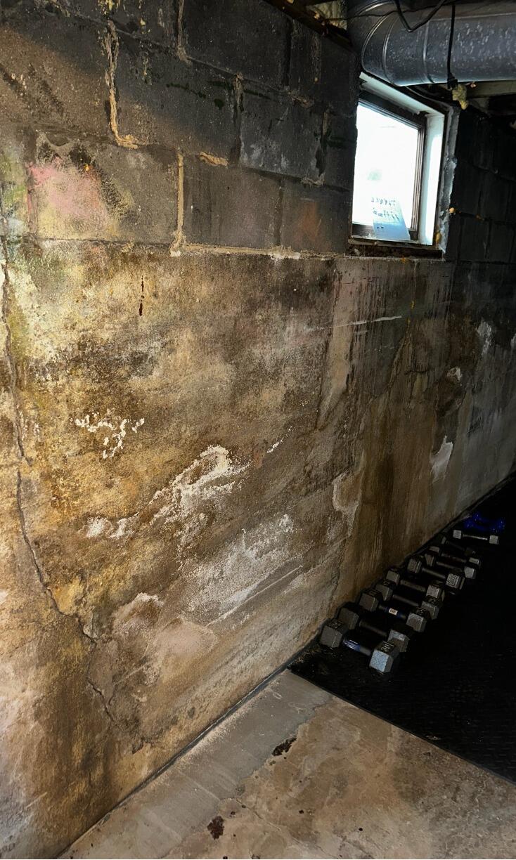 BEFORE: Similar to poured concrete walls, block walls like this one (in Glencoe, Missouri) sometimes leak at the joint between the footing and wall. This block wall foundations is also filled with mortar joints that weakened and leaked; the block itself had cracked and allowed water to leak through.