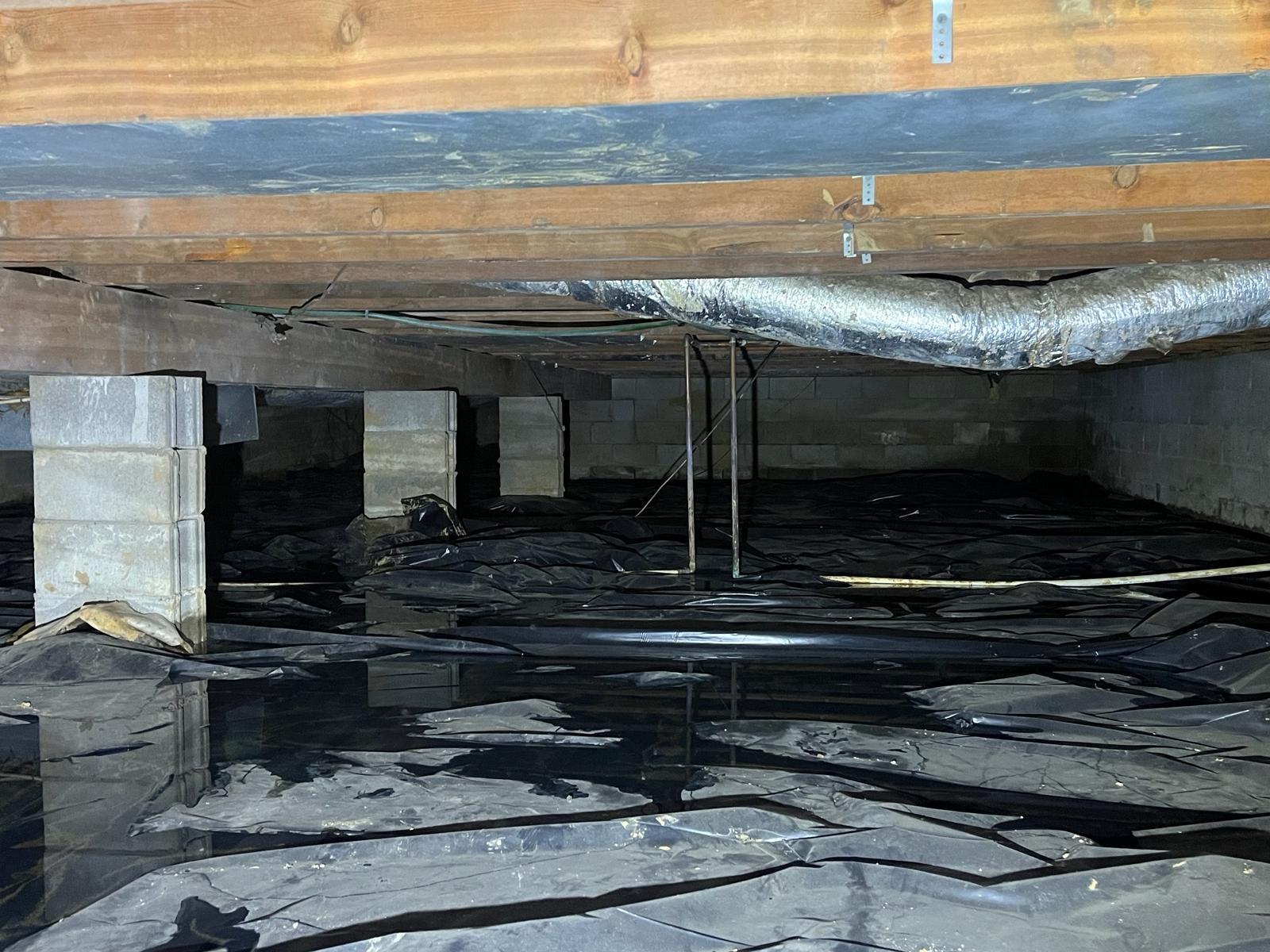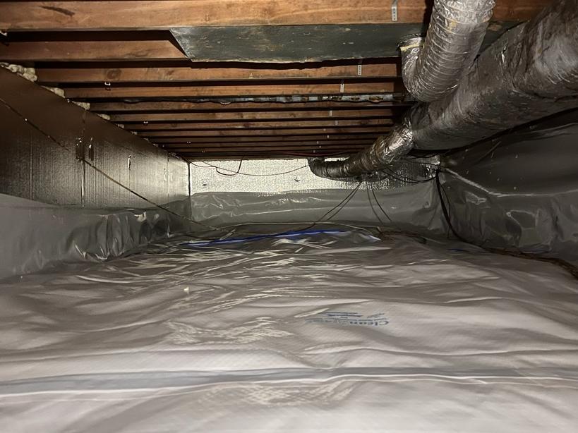 Healthy Spaces installed the CleanSpace crawl space encapsulation system. CleanSpace is an inorganic vapor barrier, so it keeps water out without supporting mold growth.