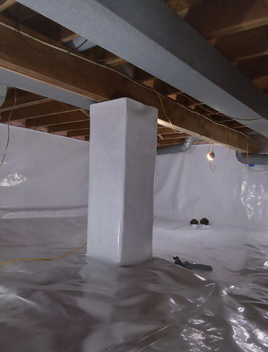 The SmartJack Support Posts were installed to raise and level the floors, and prevent them from sagging in the future. The crawl space was encapsulated with a CleanSpace Vapor Barrier to seal off the walls and floor from moisture. The dehumidifier was essential for maintaining a healthy 55% relative humidity - preventing condensation and mold growth.