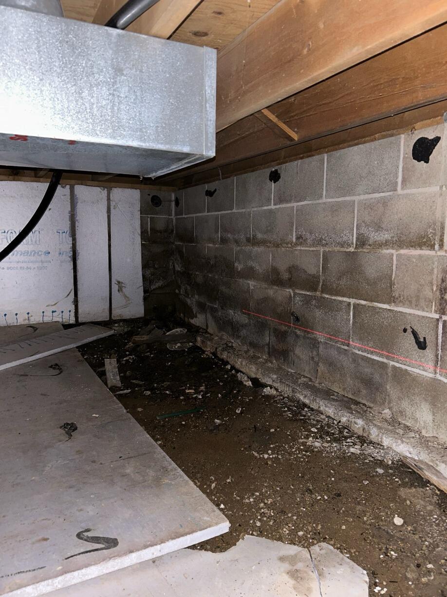 This crawl space was suffering from chronic moisture intrusion, exposed soil, and deteriorating insulation. The block walls showed staining and signs of long-term humidity issues, and the unsealed ground allowed odors, mold risk, and temperature fluctuations to rise into the living space. The environment was inefficient, uncomfortable, and potentially damaging to the home’s structure.