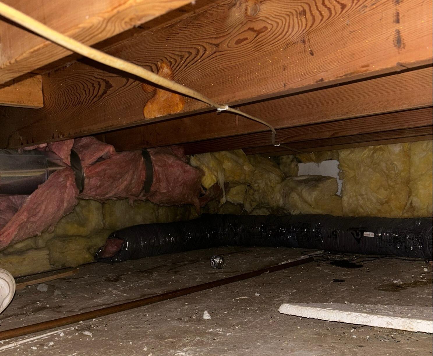 The crawlspace was damp, musty, and unprotected from moisture, leading to potential mold and poor air quality. The old, tattered insulation was inefficient and left the floors above cold. Exposed dirt and unsealed vents allowed humidity and pests to enter freely, creating an unhealthy environment beneath the home.