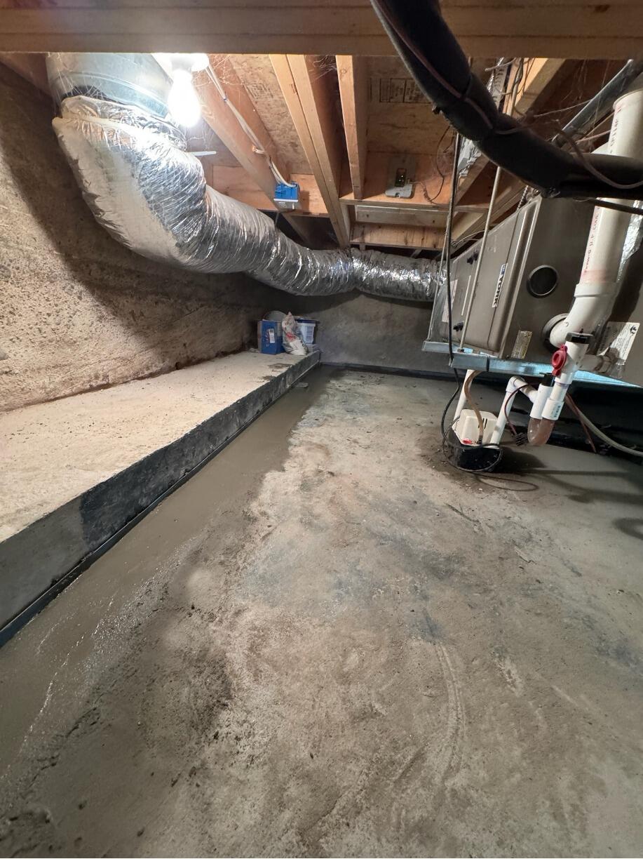 In Dover, NH, a homeowner faced repeated flooding in their basement's concrete crawl space. As seen in the before photo, water presented a serious ongoing issue. We provided a permanent solution by installing our trusted WaterGuard perimeter drainage system, which captures water seeping in and directs it to our reliable SuperSump pump system for efficient removal. In the after photo, observe the transformation: a dry and secure basement, free from water damage concerns. With Erickson Foundation Solutions, this basement is now ready for safe use year-round.