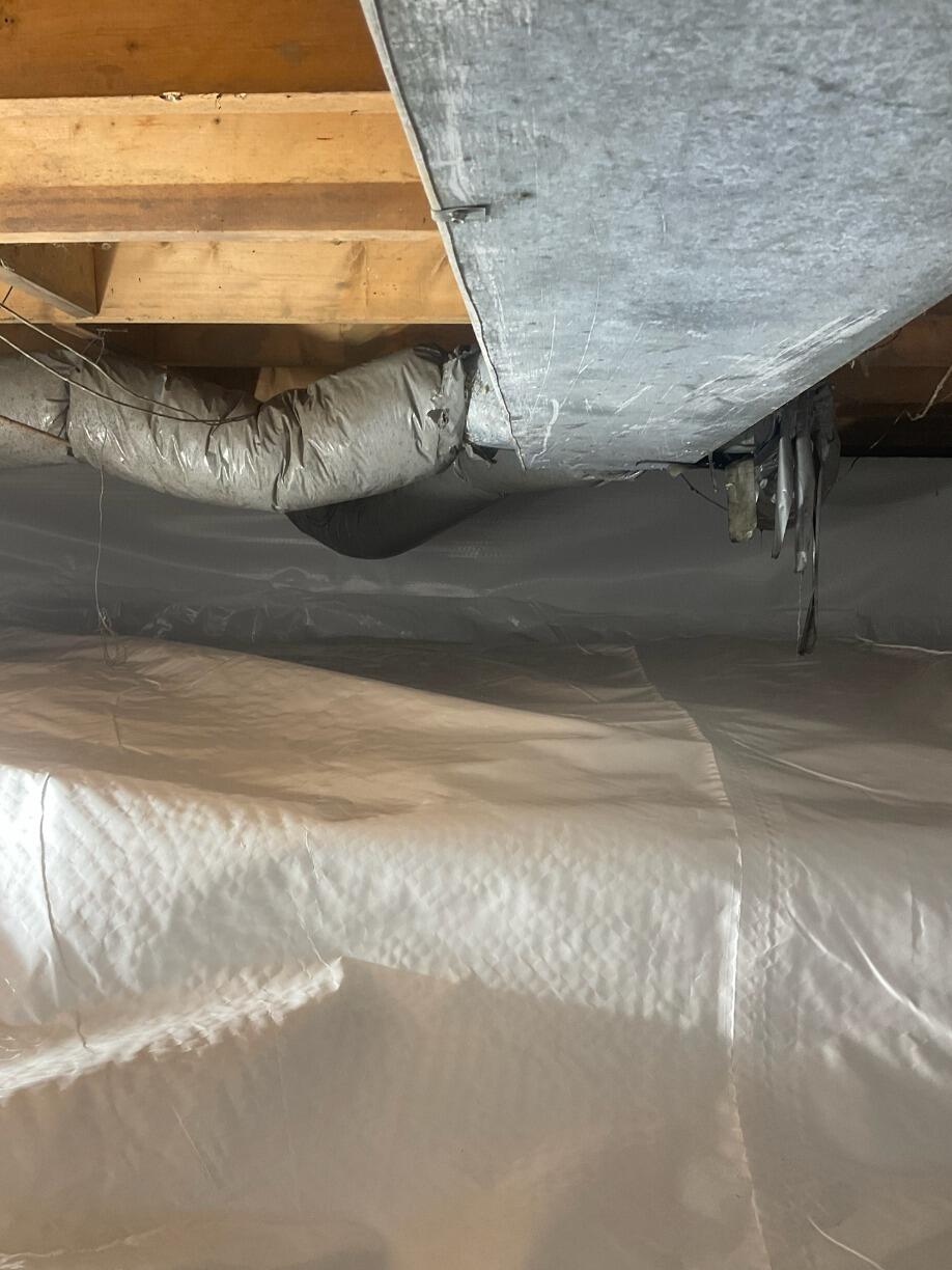 To properly address the issue, we installed our CleanSpace Vapor Barrier System, a durable, antimicrobial liner designed to seal the crawl space from the earth below and prevent moisture infiltration. This system was carefully fitted across the floor and up the walls to create a continuous, airtight barrier. With CleanSpace in place, we effectively stopped water vapor from entering the crawl space, eliminated damp conditions, and restored the area to a dry, healthy environment.