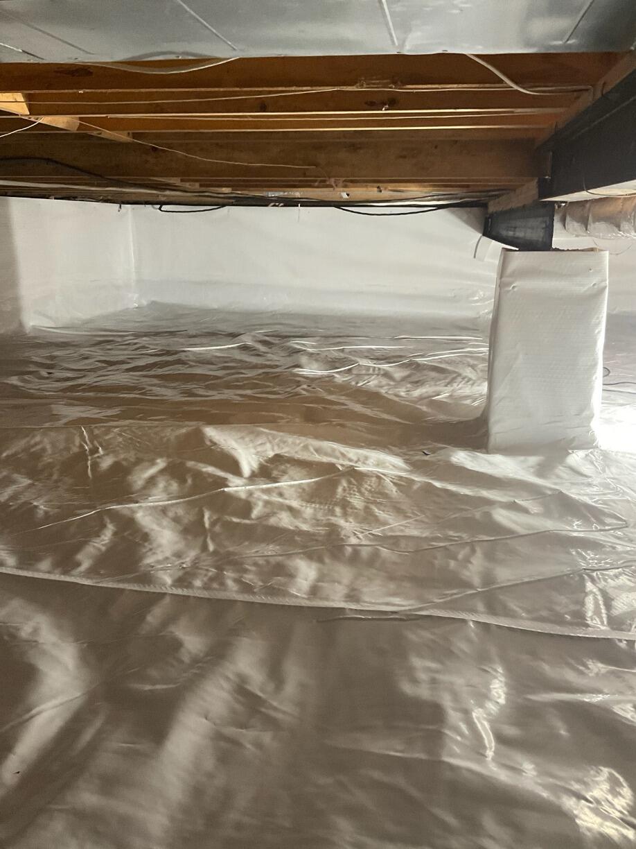 To address insulation and humidity concerns, we installed SilverGlo Insulation Panels on the crawl space walls to create a thermal barrier that resists moisture and improves energy efficiency. We then sealed the space with our durable CleanSpace Vapor Barrier System, which prevents vapor intrusion from the ground while creating a clean, dry environment. Vent Covers were added to block outside air, and a SaniDry Sedona Dehumidifier was installed to regulate humidity and ensure long-term air quality.