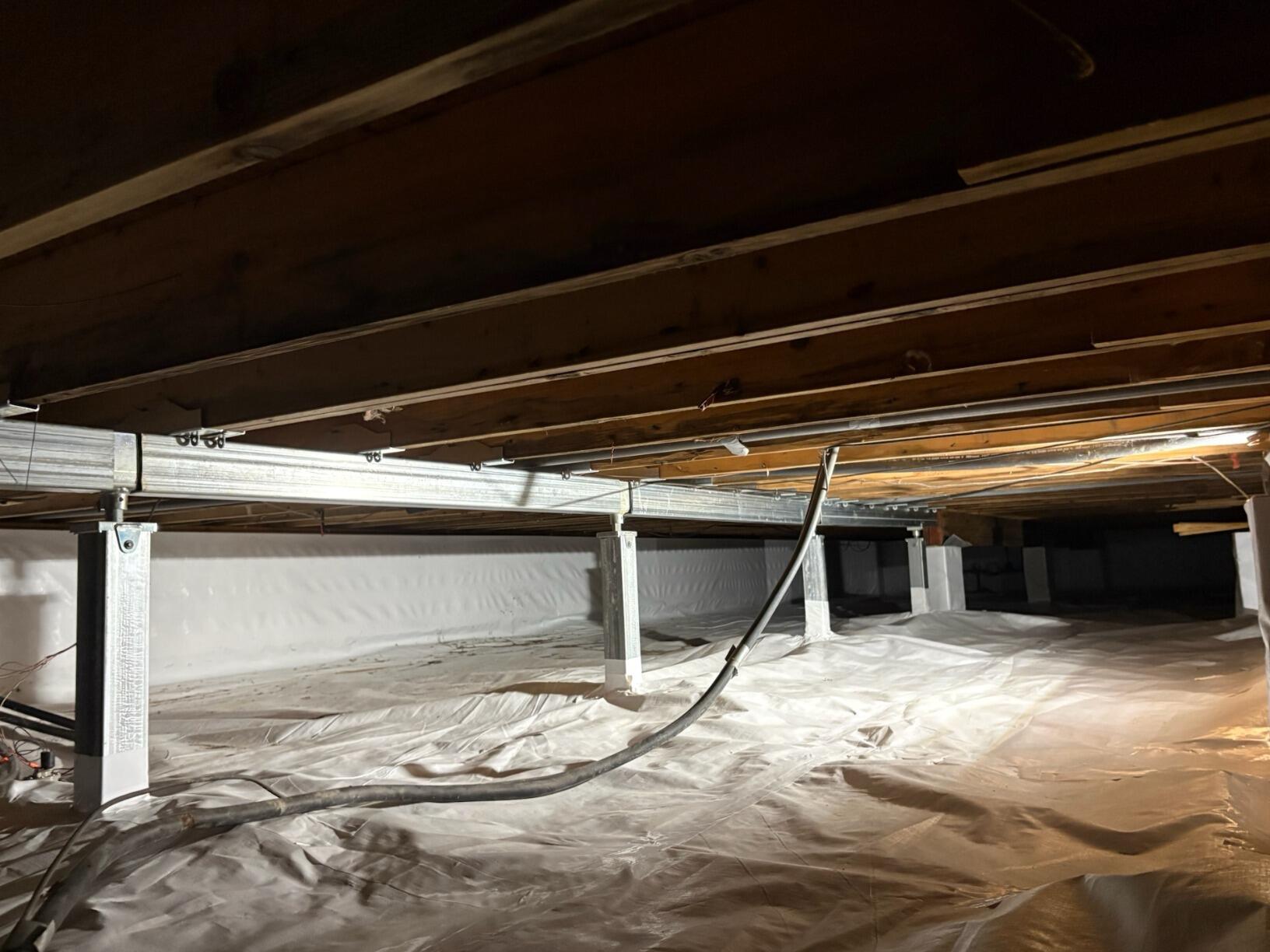 Following a detailed assessment, our team identified the primary sources of moisture and designed a customized plan to restore the crawl space to a safe and healthy condition. This approach included the installation of our patented Drainage Matting to manage water flow, our CleanSpace Vapor Barrier System to seal the area from ground moisture, and our SaniDry Sedona Dehumidifier to maintain proper humidity levels. To address the weakened beams, we installed our SmartJack Support System, providing strong, adjustable reinforcement to stabilize the structure.