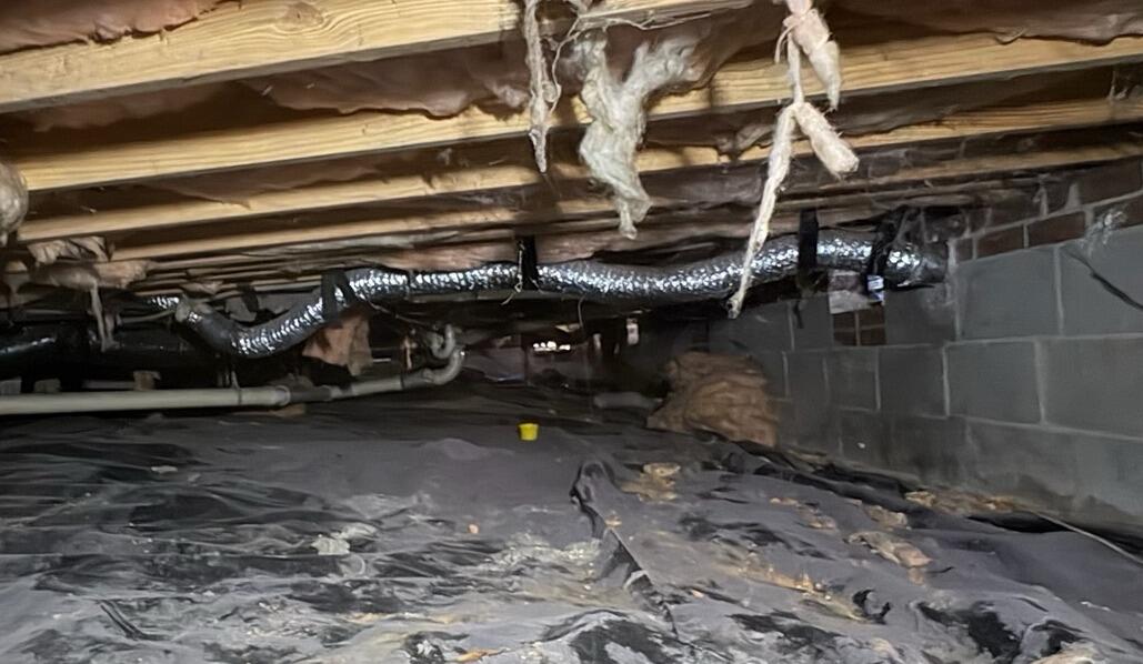 This Summerfield, NC crawl space showed several clear symptoms of moisture damage and structural stress. The old vapor barrier had broken down and was scattered across the soil, allowing humidity to rise into the floor system. Insulation was falling, wood components were exposed to moisture, and the crawl space was showing early signs of sagging floors due to weakened support.