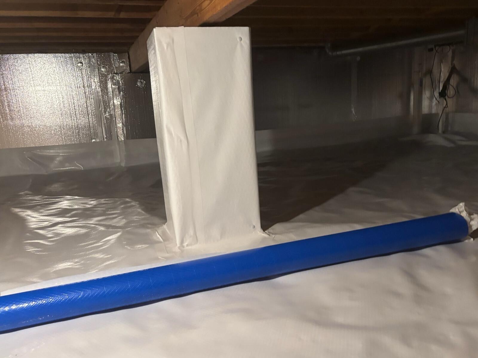 We insulated and waterproofed the walls with SilverGlo Insulation Panels. Drainage Matting was laid on the ground to provide a thermal break between the crawl space and the earth. Then, a CleanSpace Liner was installed to protect the space from moisture. CleanSpace is a 20mil thick ultra durable vapor barrier that won't rip or tear! This home is now protected from the ground up!