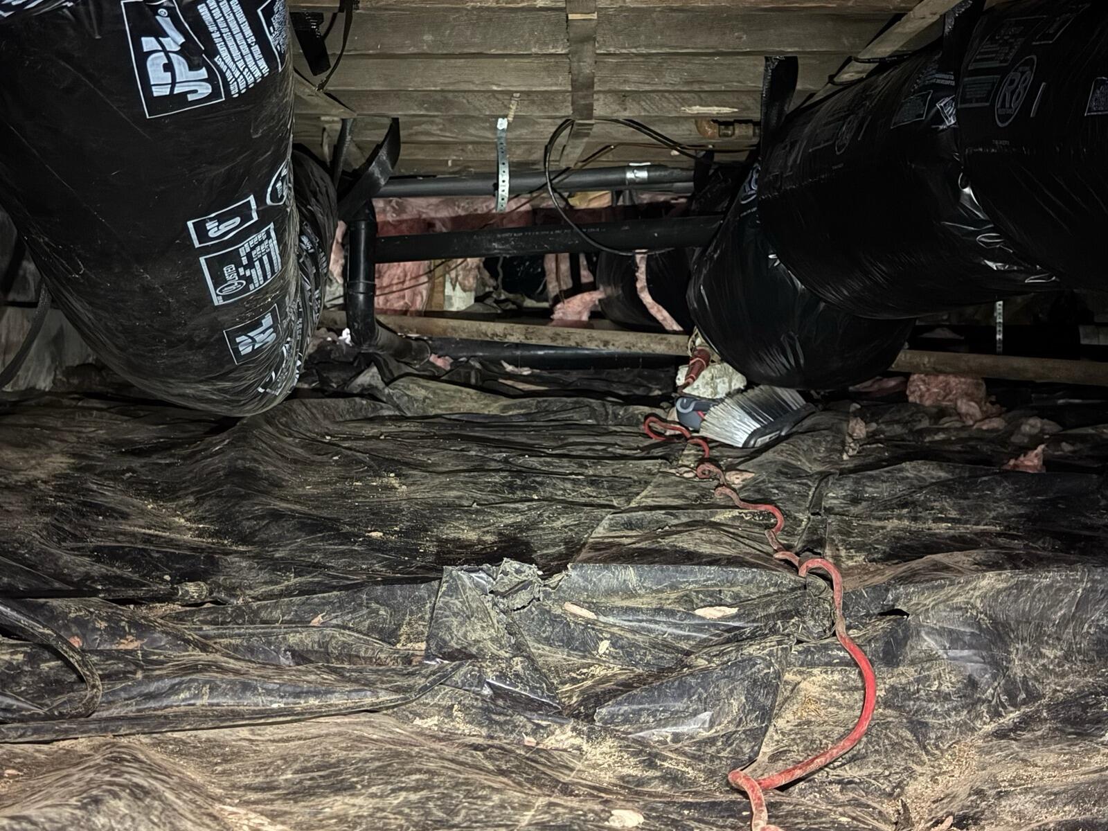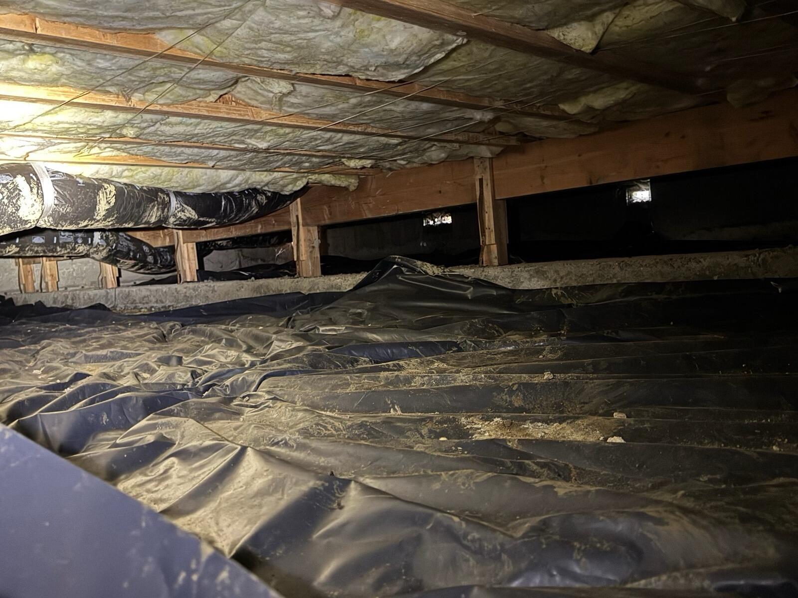 This home had fiberglass installed in the crawl space. Knowing that is was meant to be sealed in, the installers had attached a material to help hold it in place. However, moisture was still getting in. And critters got in, pulling out batches of the fiberglass and making a general mess in this space. To get the crawl space properly insulated, we put in a full encapsulation.