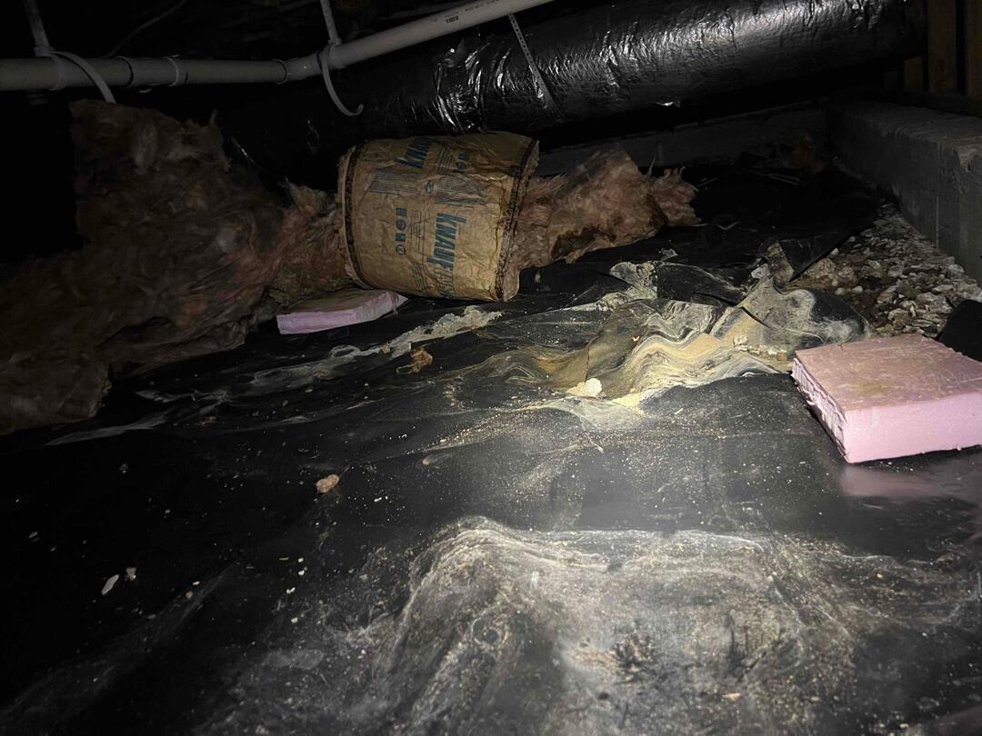 This old vapor barrier had crusted on mud. The space hadn't been checked in years, and the homeowners wanted a solution that could keep up with their waterproofing needs. To address this we installed a full crawlspace encapsulation.