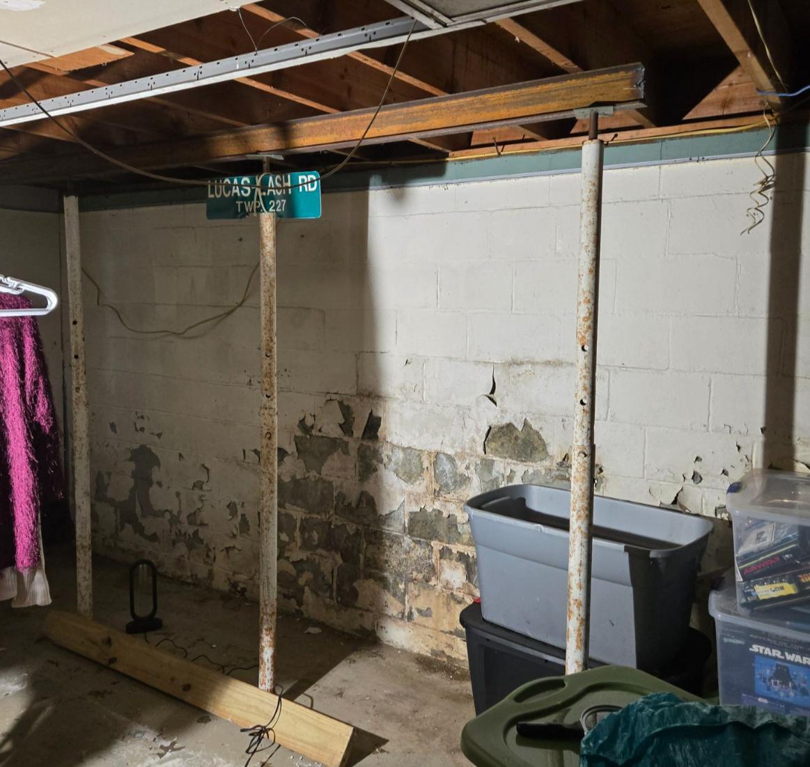 The basement had an old locust post made of wood that failed. The owner put up a a temporary support post but it did not effectively carry the weight above. Keystone installed a new SmartJacks with supplemental beam to carry the weight of the two wooden joists above.